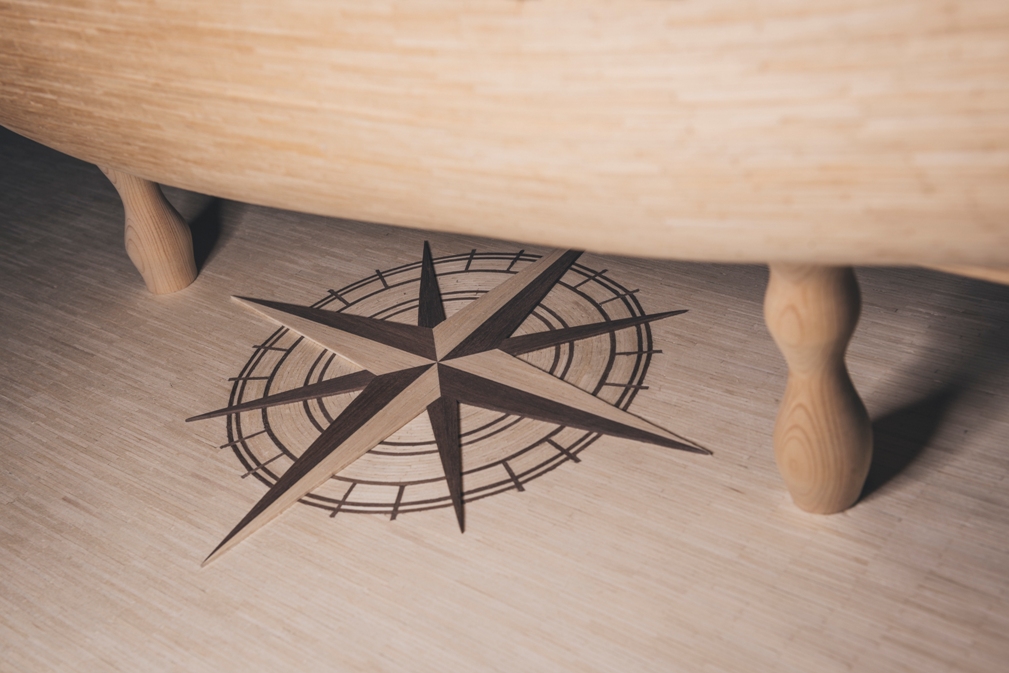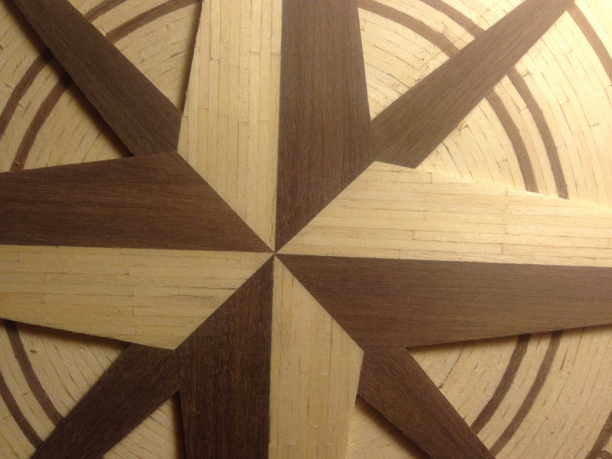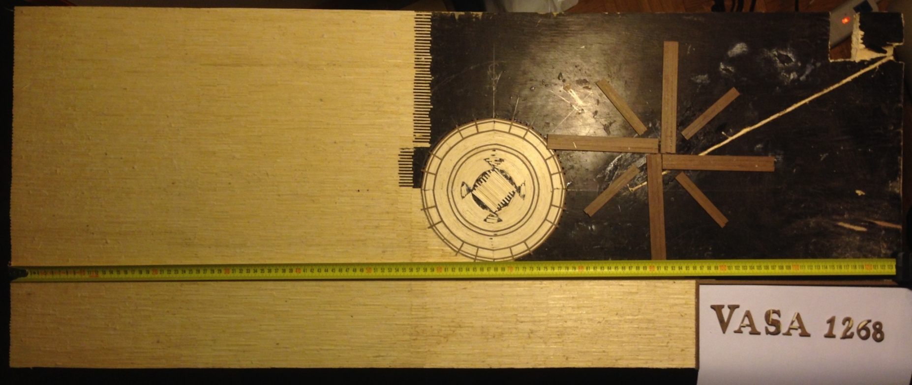 Miałem problem z doborem materiału do wykonania róży wiatrów, starałem się nadać kolor zapałkom,ale kąpiel przez całą noc, ani podgrzewanie aby zwiększyć chłonność zapałek nie pomogło. Dlatego zdecydowałem się wykonać detale z ciemniejszego orzechowego drewna - posiadałem listewki 7x2 mm oraz 5x5mm które zakupiłem kiedyś przy okazji. Po nasączeniu w wodzie udało się je dość swobodnie kształtować, ale nie udało się uniknąć pojedynczych pęknięć.