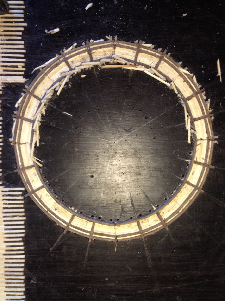 Wykonując obwody koła zmuszony byłem wykonać bardzo dużą ilość klinów które dociskały kolejne warstwy, nie udało się jednak uniknąć szpar w wewnętrznych częściach.