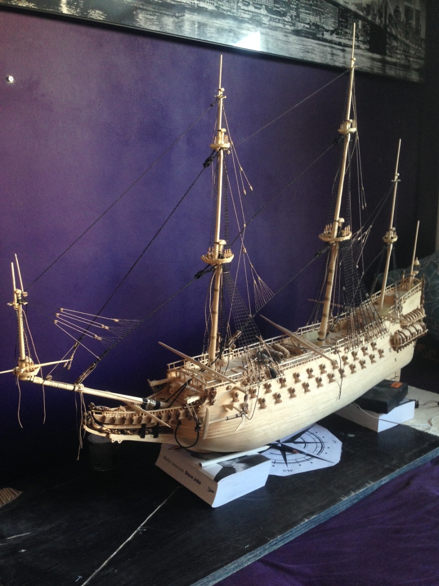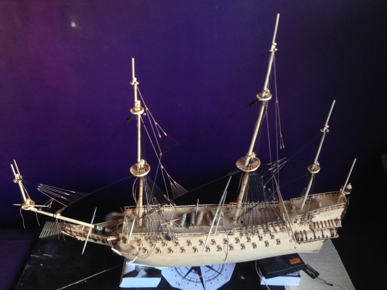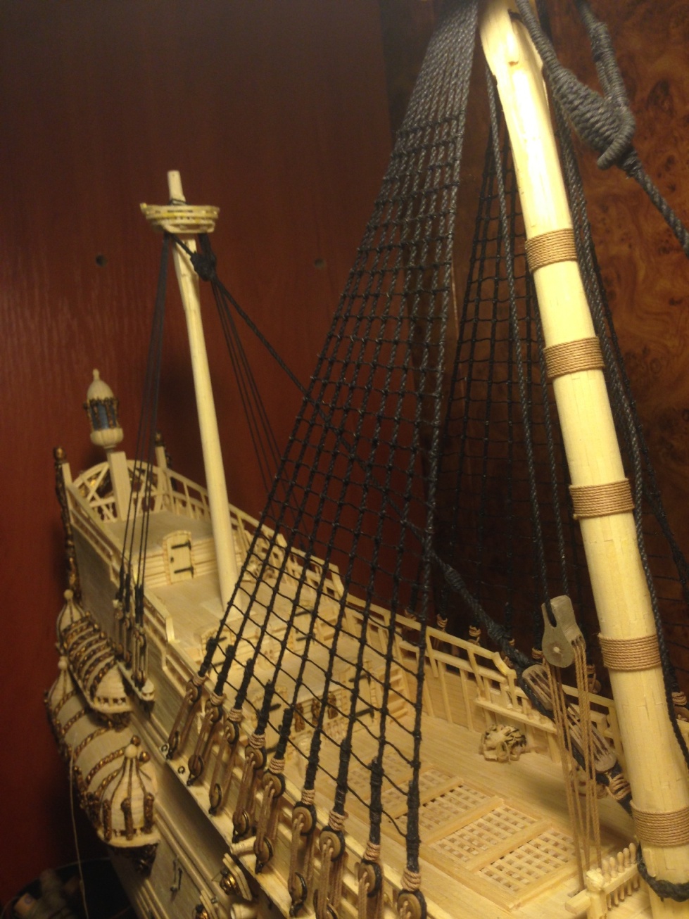 Praca poszła całkiem sprawnie i przyjemnie, jednak problem jest z miejscem. Jak by nie patrzeć jest to spory model i w pokoju 12m^2 w bloku, ciężko jest przechodzić z 1 burty na 2gą. Jednakże udało się manewrować biurkiem. Od linek po zamontowaniu niestety odstają włoski, powinienem je opalić aby nie było ich aż tak bardzo widać, ale działanie otwartym ogniem przy 4 latach pracy nie napawa mnie optymizmem.