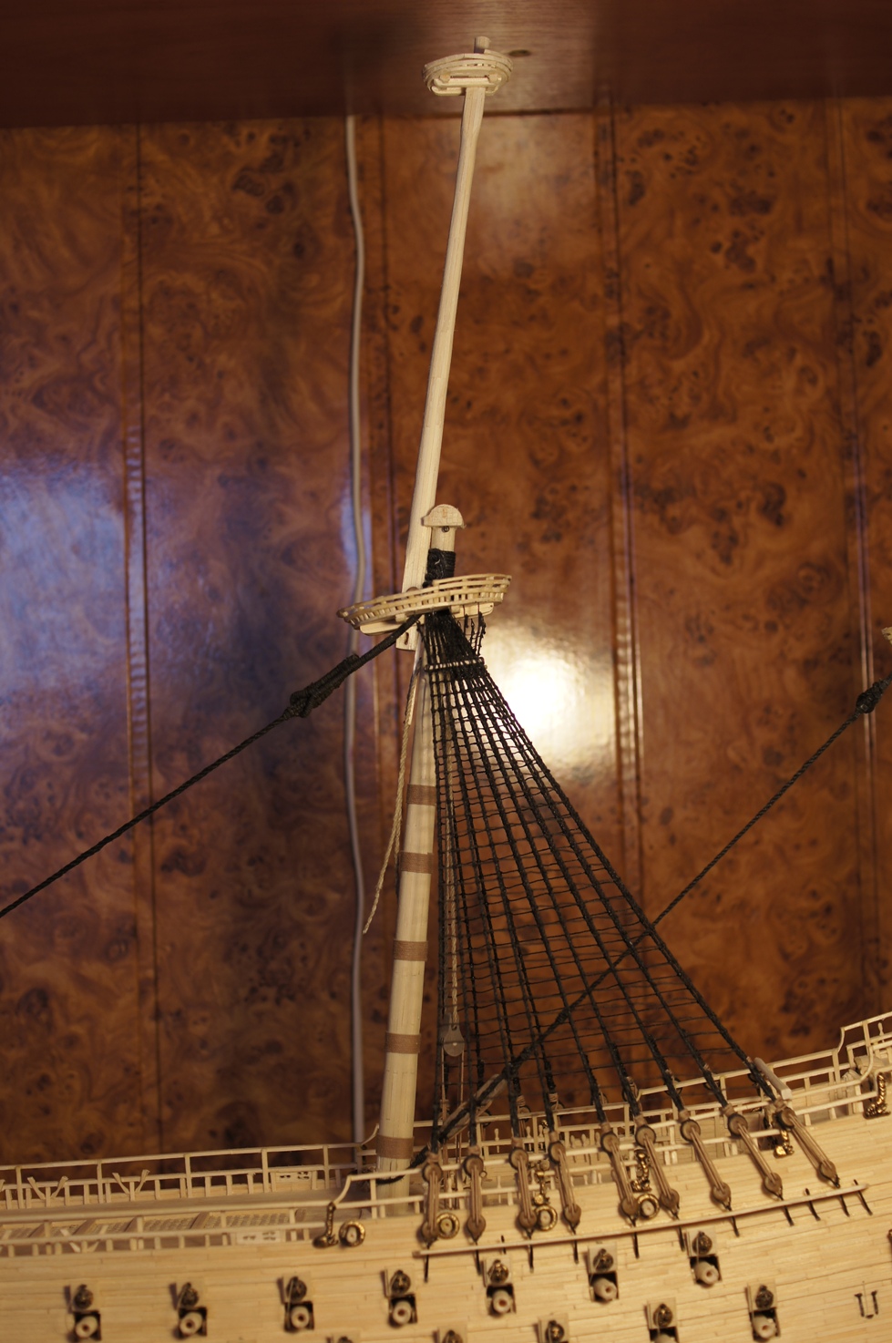 1) W jaki sposób mocowany był wyższy poziom masztu, gdzie była uwiązana ta lina, nie udało mi się tego dojrzeć na żadnym z modeli. Wydaje Mi się,że ma to związek z hakami umieszczonymi przy połączeniu masztów.