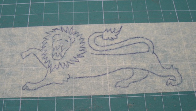 ) . Najpierw na taśmie malarskiej samoprzylepnej narysowałem lwa ( potworka ) właściwie odkalkowałem i wyciąłem środek nożykiem usunąłem a taśme z wycietym konturem lwa przykleiłem do żagla i tak trzy razy. Całość strzeliłem spreyem złotym . Po wyschnięciu odkleiłem taśmy i ołówkiem oraz czerwonym mazakiem zrobiłem kontury grzywy i mordy tego niby lwa.