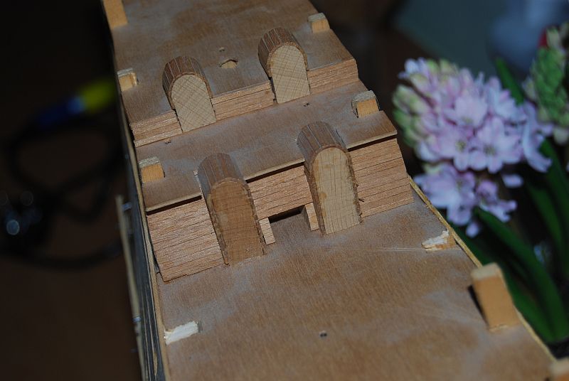 Z pierwotnie raczej obłupanych niż obrobionych klocków lipowych wypełniających dziób wykonywałem wypełnienie . Okazało się że szablony na planie różnią się od tego co ma być założone na okręcie o 5 mm na wysokość. Trzeba było trochę pomyśleć żeby do tego dojść i na sucho spasować całe wyposażenie na dziobie. Tak więc ktoś tam z Corela przedobrzył a lajkonik co wcześniej konstruował założył poprzednio tak jak dostał.