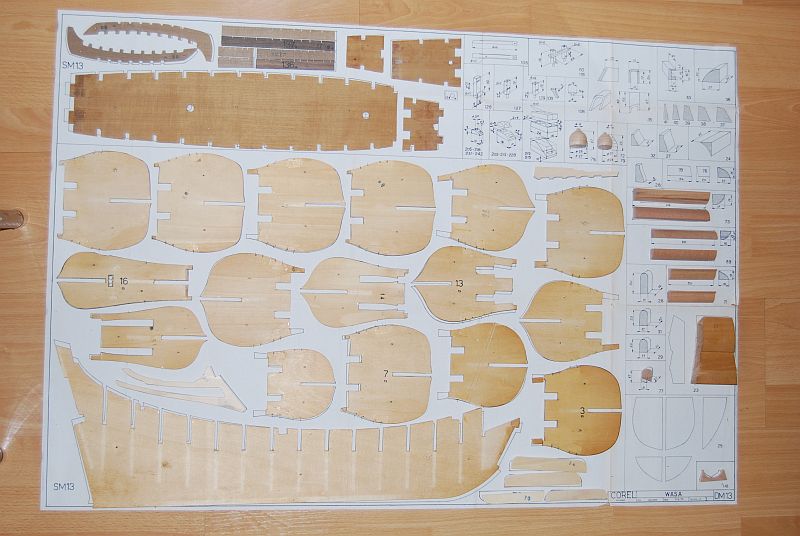 W poniedziałek dotarł do mnie nowy nabytek. Z całego zestawu brakuje jedynie mały lew który jest nad galionem dziobowym czyli dużym lewem, i szalupy. Zestaw jak po notatkach na instrukcji wnioskuję pierwotnie był zaczęty przez jakiegoś Skandynawa i wyprodukowany w roku 1985 może 1984 . Wczesna wersja produkowana przez firmę COREL. Wszystko wycinane frezem na każdym elemencie są dziurki po kołkach utalających. Ów Skandynaw miał chyba blade pojęcie o szkutnictwie, Na szczęście to co widać na zdjęciach jest posklejane jakimś przezroczystym klejem który łatwo się poddaje acetonowi ulegając rozpuszczeniu. Wręgi są w ogóle tylko po stykane bez kleju. Dwie wręgi nawet pomylił. Wyszedł z założenia że po co tam dawać klej jak ładnie pasuje