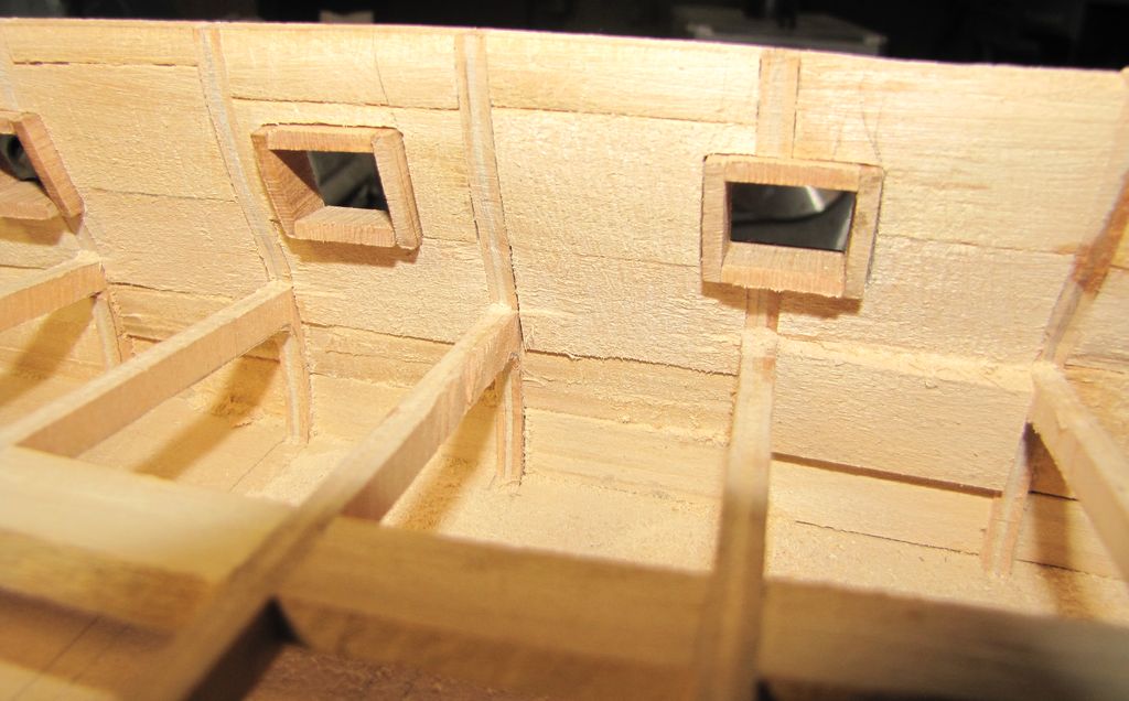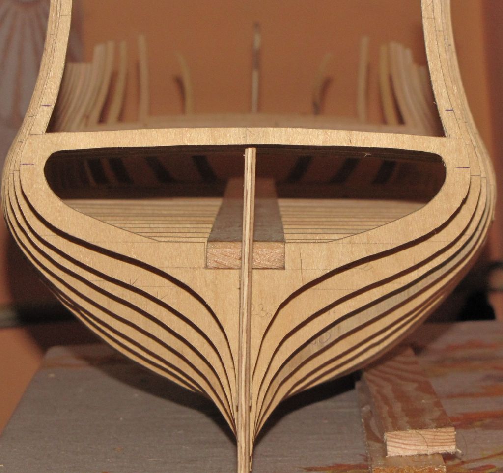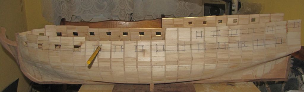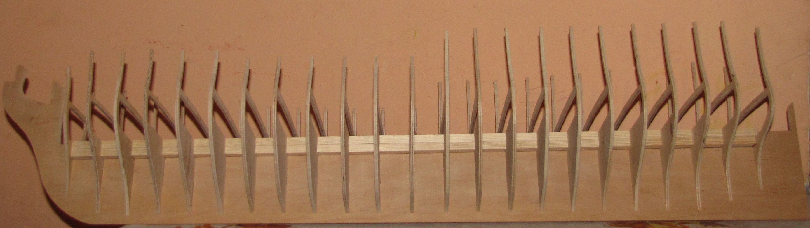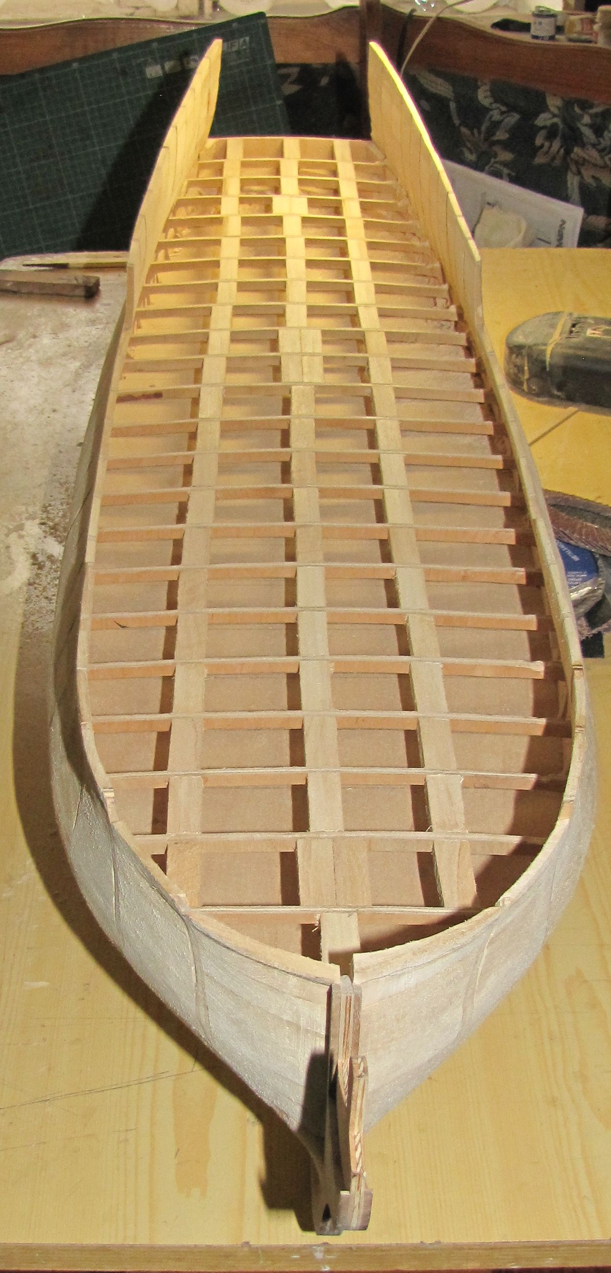Zaczynam poszywanie wewnętrzne burt, materiał to oczywiście grusza, listewki 6X2mm. Jak widać na poniższych obrazkach, listewki układają sie bardzo ładnie, chciało by się powiedzieć same