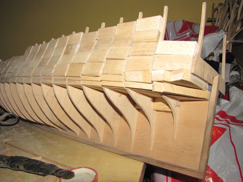 Przed położeniem pokładu trzeba zrobić te, jak im tam...water... coś tam, no po mojemu to taka przejściówka z pokładu w burte. U mnie to cuś ma kształt trapezu czy jakoś tak.