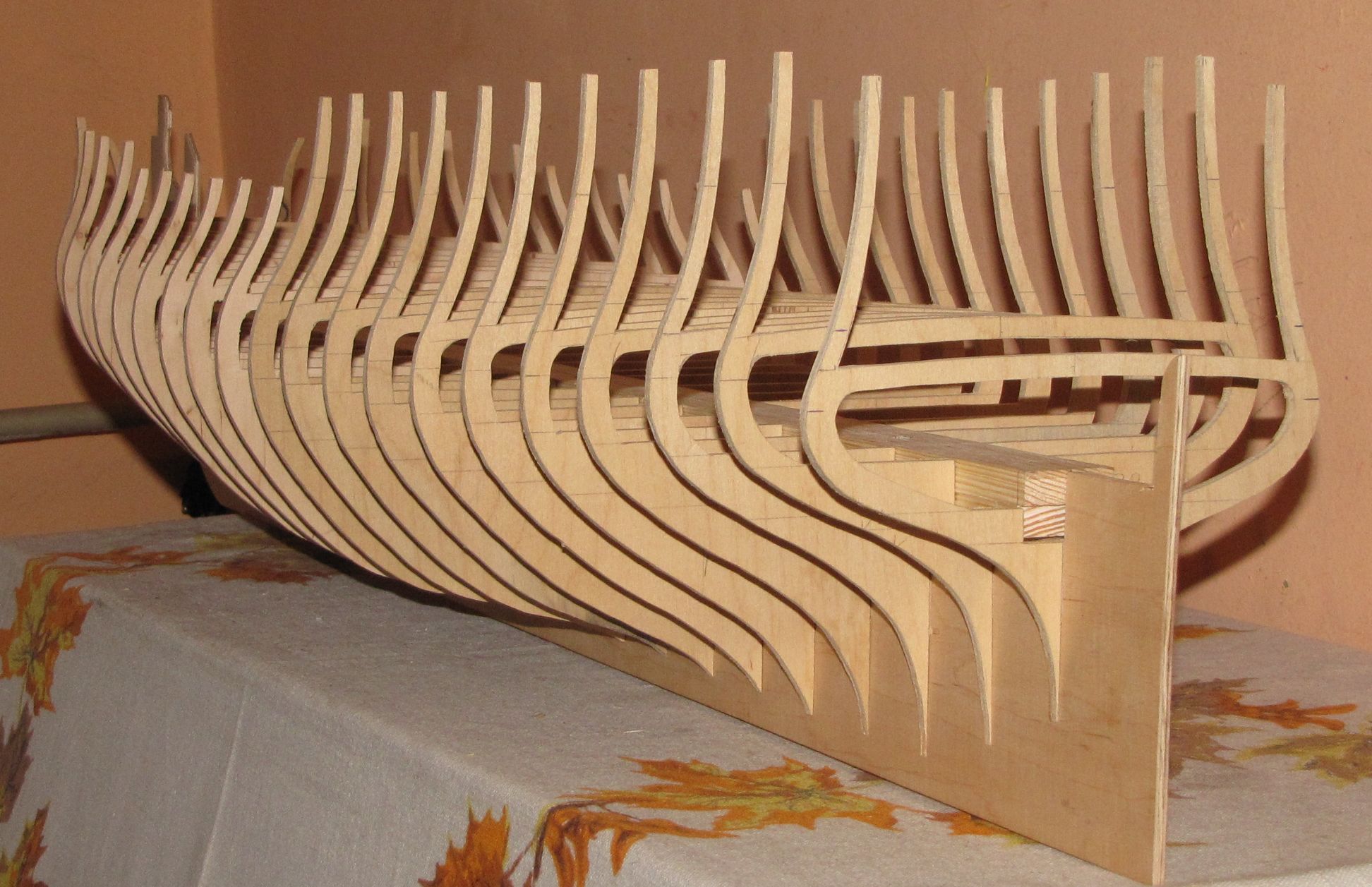 podłużnica:sklejka 4mm, wręgi: sklejka 4mm, belka sosnowa jako usztywnienie:sosna 30X20mm