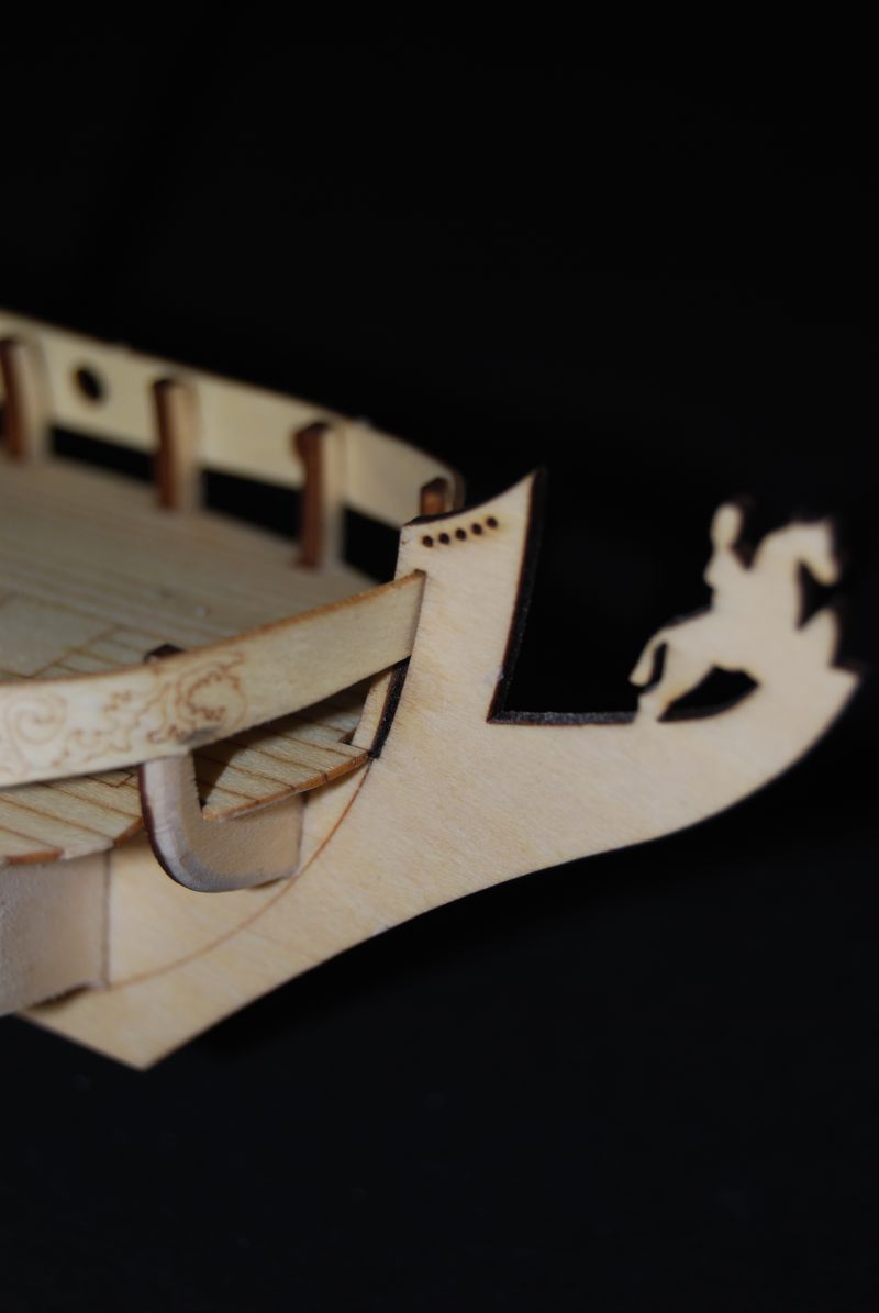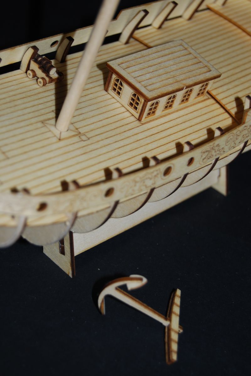 Jak komuś się nie podoba taka przypalona krawędź to sobie może szlifnąć krawędzie papierkiem ściernym. Jaki to problem ??? Model ma mieć walor edukacyjny i pokazać z czym się w ogóle je modelarstwo szkutnicze. Ma propagować nasze hobby. Tę funkcję akurat spełnia. Co do kolorystycznego wykończenia to zależy to przecież od modelarza. Akurat ta sztuka już idzie do mojego znajomego w takiej a nie innej kolorystyce bo jemu się taki podoba. Następne 2 będą w kolorystyce historycznej i troszkę podrasowane w detale.
