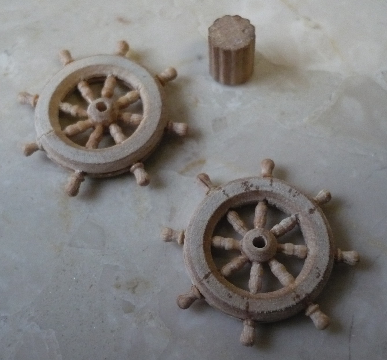 Zakończyłem "walkę" ze sterem. W trakcie robót pojawiały się różne koncepcje - od dwóch kól sterowych do wersji ostatecznej z jednym kołem sterowym - efekt końcowy jak na zdjęciach. Jednocześnie dopracowane zostały knagi drewniane - pozostało jeszcze delikatne szlifowanie, bejcowanie i polakierowanie.