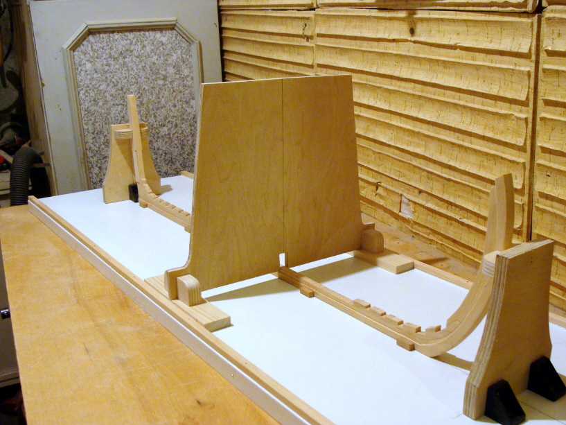 Stocznia jest bardzo prosta,bez dodatkowych gniazd montażowych.W to miejsce zastosowałem ruchomy ekran, który bardzo ułatwia pracę.Wręgi narazie tymczasowo wciśnięte do pomiarów.