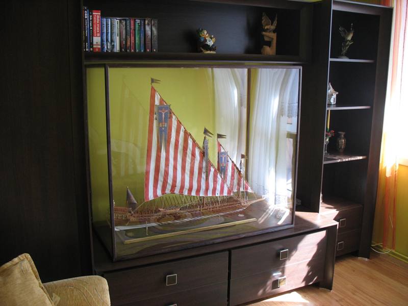 Galera doczekała się gabloty. Wykonałem ja z poliwęglanu 2,5mm co zmniejszyło wagę o jakieś 30kg porównując tej samej wielkości wykonaną ze szkła 4mm. Wielkość gabloty szerokość 120cm wysokość 100cm głębokość 60cm- koszt ok 300zł .