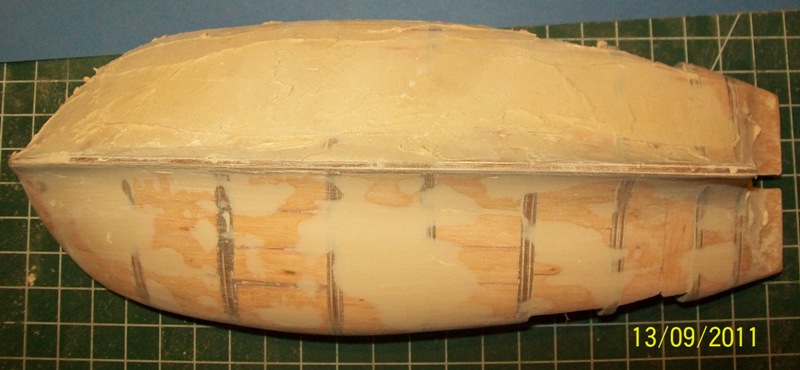 Masz wykonane wypełnienie między wręgowe. Czy planowane wykonanie dodatkowego poszycia z olchy to nie przesada? Na tak przygotowanym kadłubie ja bym kładł od razu docelowe poszycie.