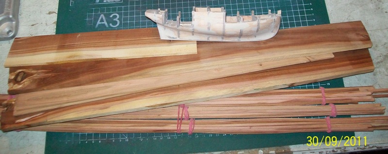 A tu sobie zamontowałem jeden pokład - ten tylni. Byłem ciekawy jak się to wszystko prezentuje w "kupce". Dodatkowo wyznaczyłem sobie linię od której będę poszywał burty - chcę to zrobić jak najszybciej, aby odciąć "wąsy" pomocnicze oraz zamontować pokład główny. Wydaje się że listeweczki Mirka będą się bardzo fajnie gięły - podobno po moczeniu w gorącej wodzie jeszcze lepiej...
