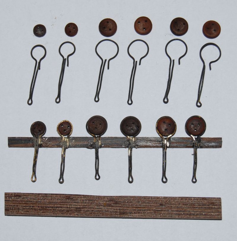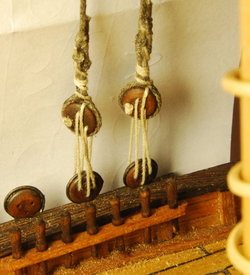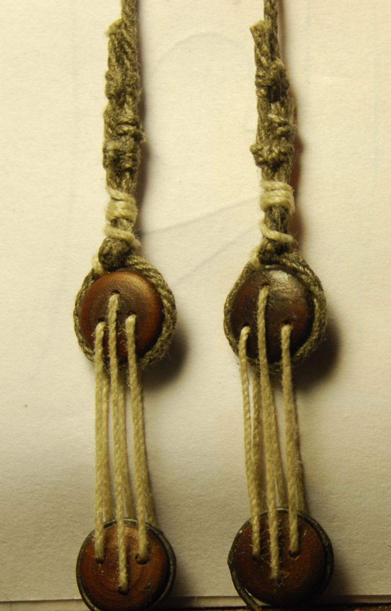 Tak sobie plotę. Nici wantowe plecione z 9 szt do grubości 0,9 mm ((3 x 0,1) x 3)). Przewiąz talrepowa beżowa nic ariadny ADA 15. Wiązania tą samą nicią tylko czernioną. Czernienie bez fanaberii pastą do butów kupioną w Ryłko w tubce z wygodnym apliatorem z pianki która o dziwo nie uległa pocięciu. Następnie po wyschnięciu przetarte terpentyną bezzapachową. Docelowo jeszcze przelecę je olejowoskiem. Po tych zabiegach bez opalania rzadnego włosiwia nie widać o dziwo. Całość wiązań poczynione zgodnie z Lennarth Peretersson "Ringing Period Ship Models ". Na zdjęciu nagle znanej firmy :" Jan Niezbędny" potraktowane w odpowiedni sposób mechanicznie oraz barwione bejcą teak. Jeszcze dostaną olejowosku.