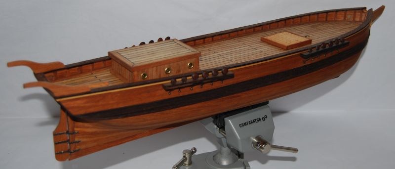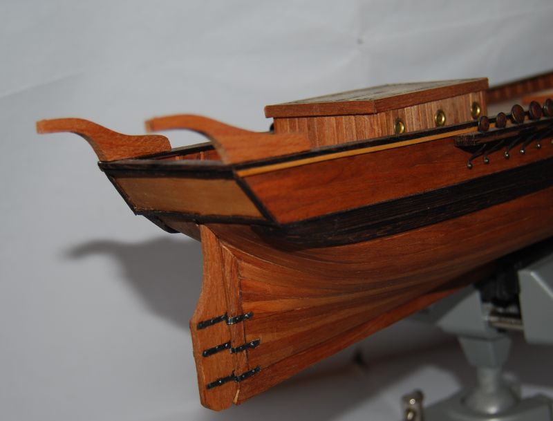 Właśnie się dopatrzyłem że nie ma ciągu relacji. Już się poprawiam. Na planie jest aby uzbroić jednostkę w 6 armat. Wystają one jednak ponad burtę tak jakby jednostka była dozbrojona w okresie późniejszym. Nie wiem czy nie zrezygnować z armat ponieważ kłóci mi się to wizualnie ( armata bez furty pod nią ?) Pokład przy użyciu papieru ze sklepu artystycznego w arkuszu A3 i kołków z wykałaczek wierconych na 0,6 mm wyszedł chyba nie najgorzej. Na lustrze rufy wstawię jeszcze półkoliste rzeźbienie ( jakieś liście ) oraz tabliczkę z nazwą rzeźbioną na proporcu podwójnie przeplecionym. No chyba że powieszę wcześniej szalupę i mi całość rufy za słoni to po co mój trud :-) Roboczo wiszą żagle. Dałem ciała bo nie wiem czy drzewce zostawić takie jasne tylko poolejowane i same ściemnieją czy może je strzelić na teek. Wiąże że to jednak z odcięciem jednego żagla od rei ( czy jak tam ona się zwie na gaflu )