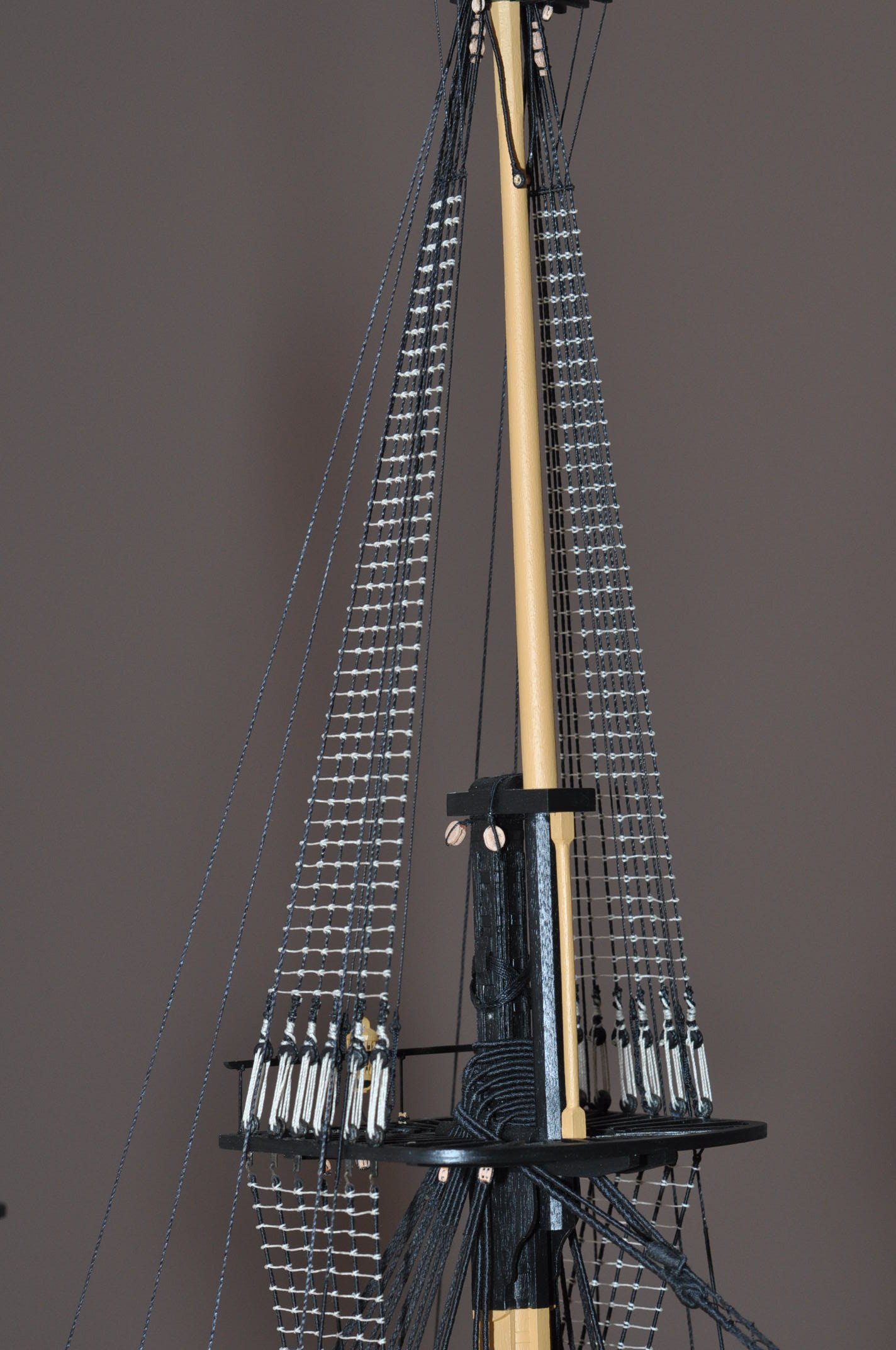 Bramstenwanty oraz fokstensztag i pomocniczy fokstensztag zawieszone na modelu .