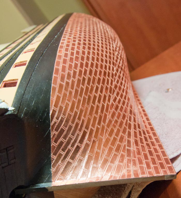 , przedstawię postępy w miedziowaniu kadłuba.Obecnie skończyłem jedną połowę.Płytki z zestawu.Wiem ,że maja nity tylko na brzegu.Postanowiłem jednak w związku z ilością elementów nie przerabiać ich.Pozdrawiam