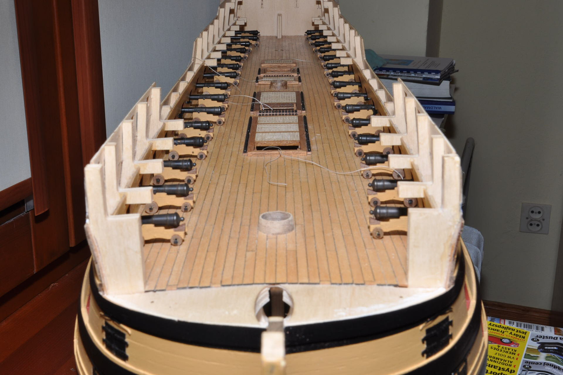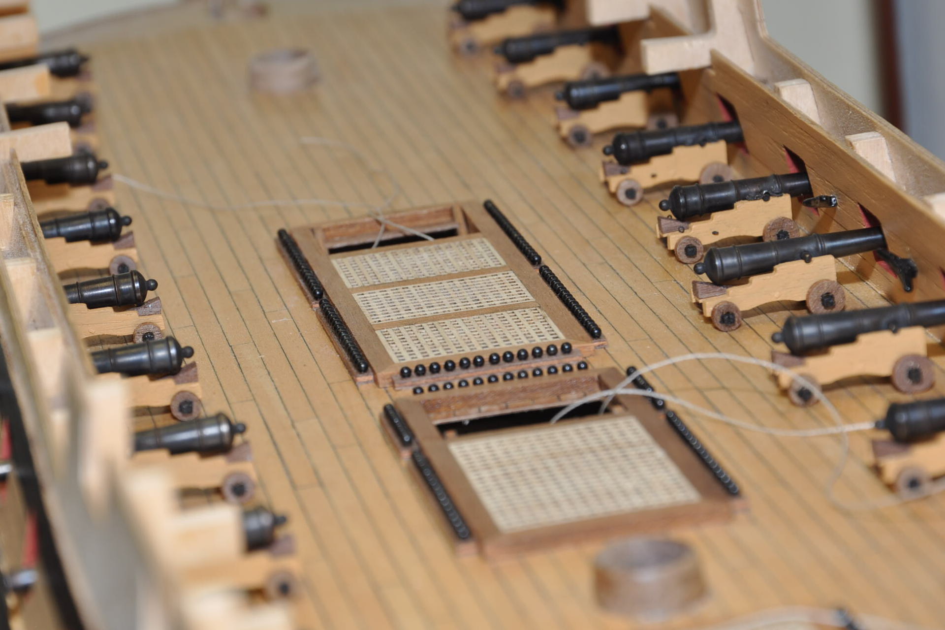 Witam. Płytek miedzianych nie lakierowałem. Obecnie zajmuję się górnym pokładem działowym .Armaty 12 funtowe potraktowane preparatem do czernienia mosiądzu , część lawet już z okuciami . Pozdrawiam