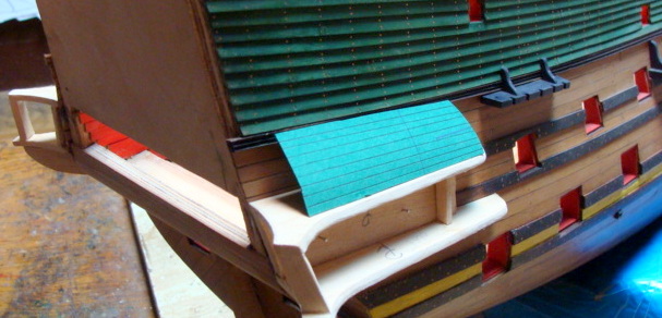 Zamontuj miedzy tymi poziomo biegnacymi elementami (bialymi na Twym modelu) serie pionowych wspornikow, cos w stylu jak to widac na zdjeciu pod tym linkiem, po czym naklej na nich scianki boczne galerii rufowych: