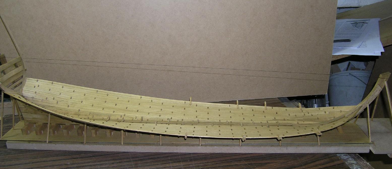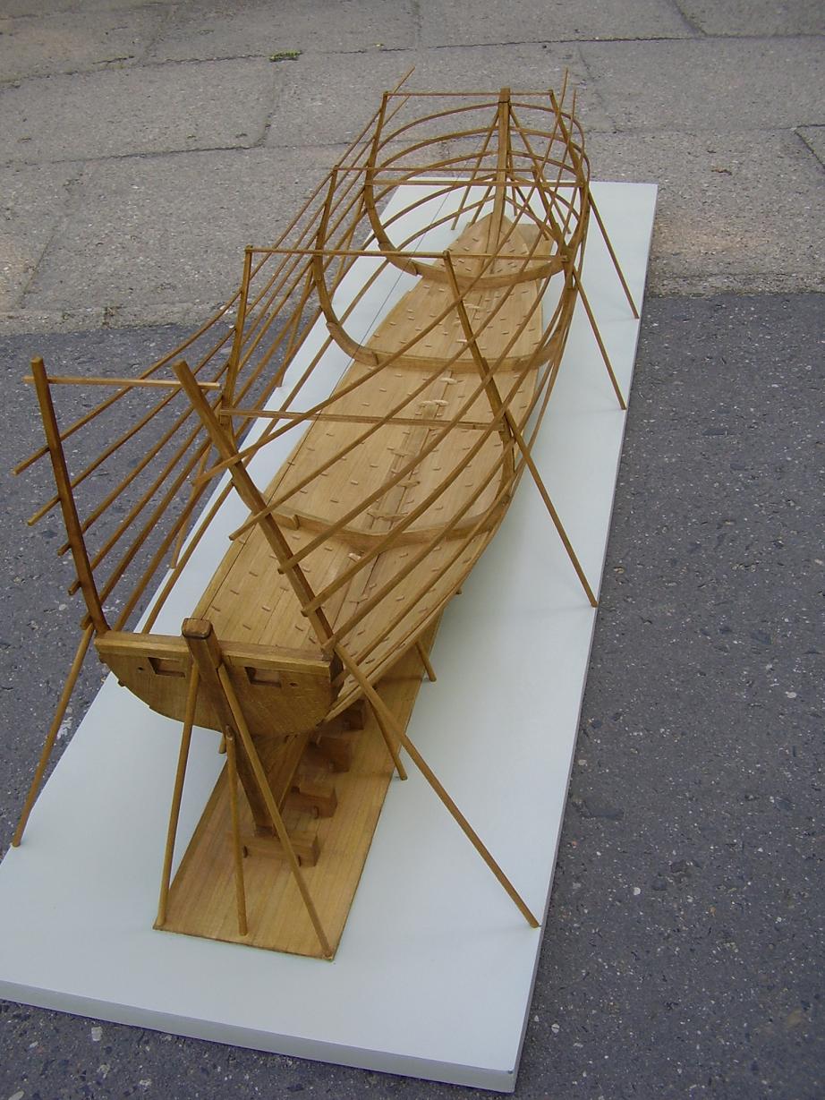 etap I to wczesna faza z pawężą oraz częścią poszycia dennego, etap II to "to samo" plus wręgi z listwami montażowymi kształtującymi obrys żaglowca oraz etap trzeci - w pełni owrężony kadłub z poszyciem dociągniętym do dolnego pasa ambrazur. Czwarty etap to pokazany już przeze mnie model.