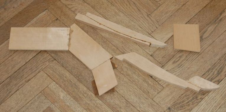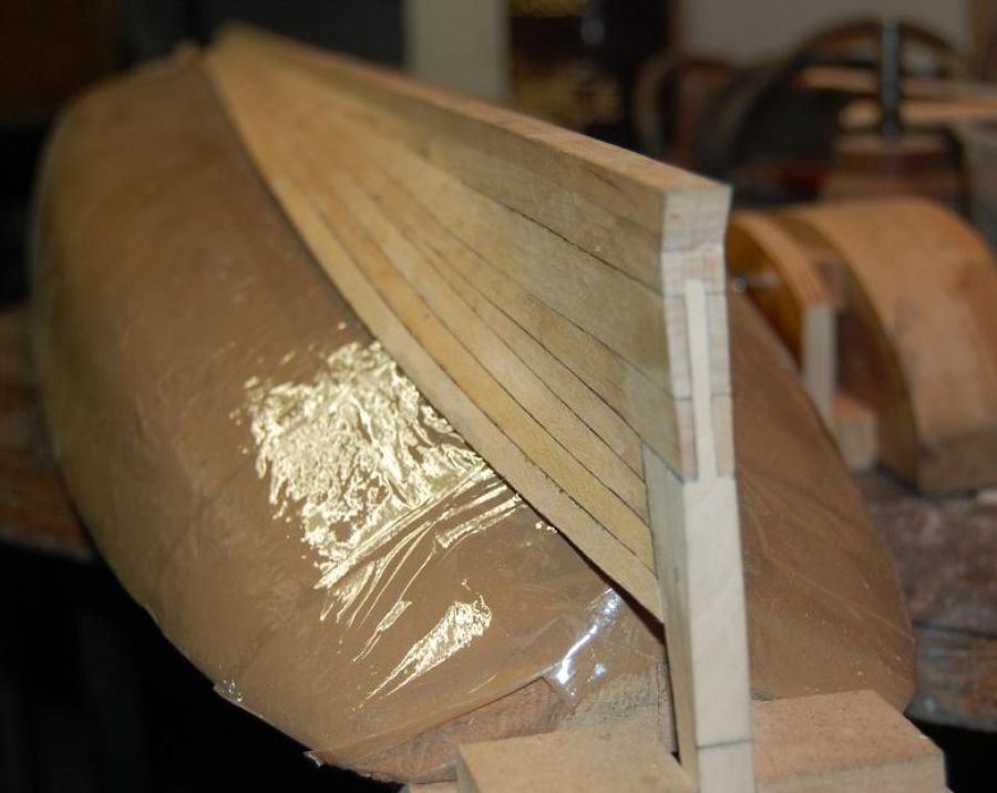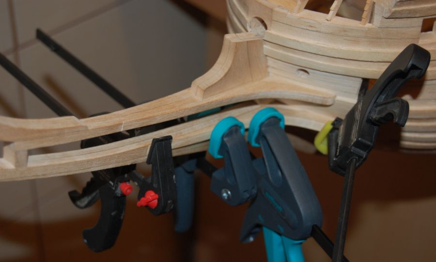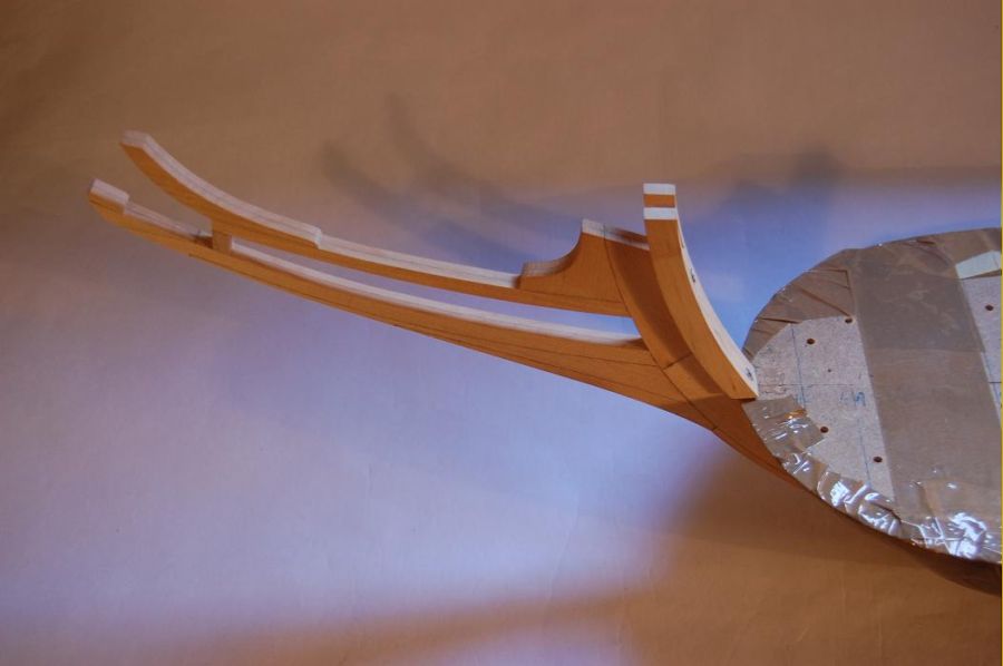 Budowę rozpocząłem standardowo od sklejenia obu stew oraz stępki w jedną całość. Stępka klejona była z dwóch listew złożonych "brzuchami" do zewnątrz na płaskim stole. Stewa dziobowa z przygotowanego posklejanego elementu (rys 1) na którym wyrysowałem właściwy kształt i wyciąłem. Potem do stewy doklejałem dziób galionu - elementy po kolei zgodnie z liniami podziału (rys 2). Na koniec całość na szlifierce taśmowej zeszlifowałem obustronnie na płasko. W stewach należało zrobić wcięcie na planki (kil wcześniej został frezowany na pilarce tarczowej proxxon) - dłutowałem je własnoręcznie przygotowanym dłutem o właściwej szerokości (rys 3). Cały element ustabilizowałem na kopycie (rys 4) przy pomocy sporych wkrętów. Podczas doklejania nowych planek całość musiała być wielokrotnie zdejmowana z kopyta dla skorygowania kształtu krawędzi (na rys 5 widać że planka dziobowa ma niewłaściwy kształt - zawsze dawałem z naddatkiem który potem usuwałem zdejmując każdorazowo skorupę z kopyta). Kolejne planki doklejałem dobijając klinami dla całkowitego wyciśnięcia nadmiaru kleju.