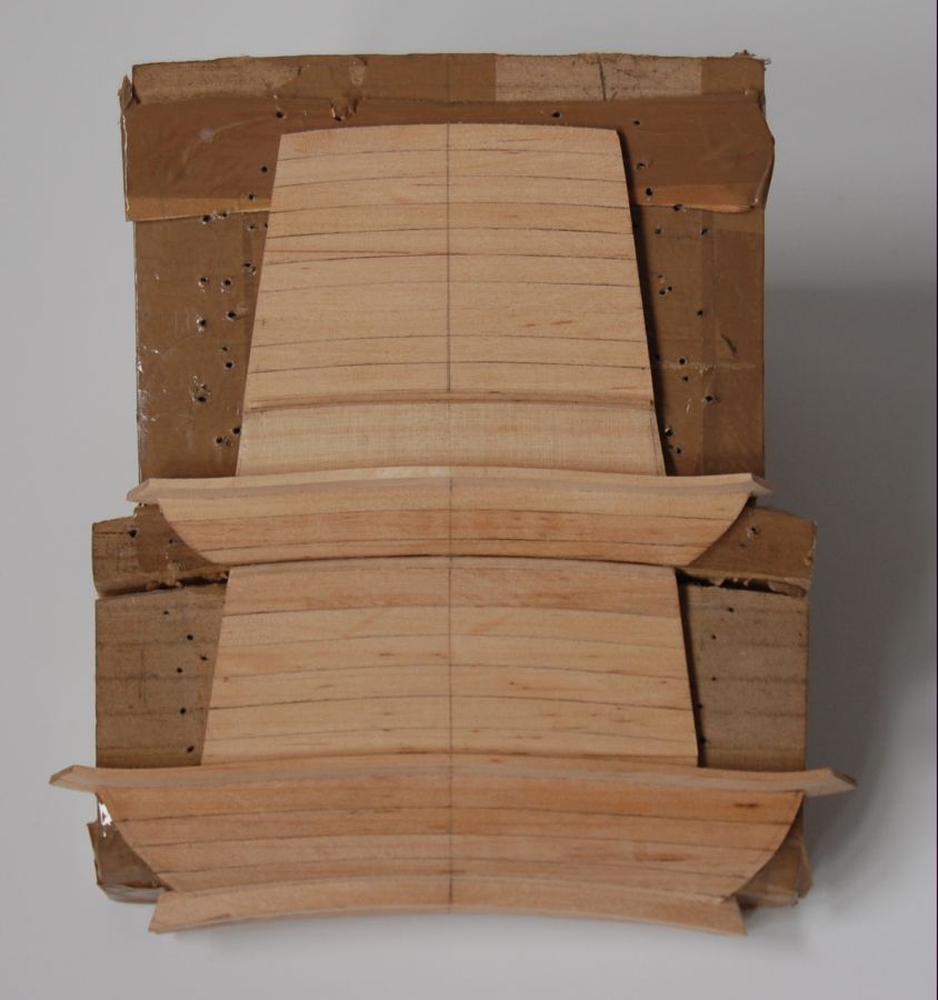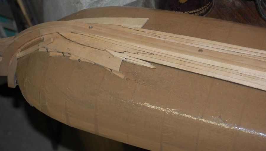 Pawęż przygotowywałem w "międzyczasie" plankowania (rys 7). Dokleiłem do stewy i ustawiłem symetrię blokując od strony kopyta wklejając po obu stronach bloki zaporowe. Możliwe było klejenie dalszych planek (rys 8). Konieczne stało się wydłużenie kopyta poprzez wstawienie wręgów z MDF i ich ustabilizowanie aby się nie kiwały (rys 9) Wykonaną na kopycie wyższą część pawęży (rys 10) dokleiłem i znowu planki w górę (rys 11 i 12)