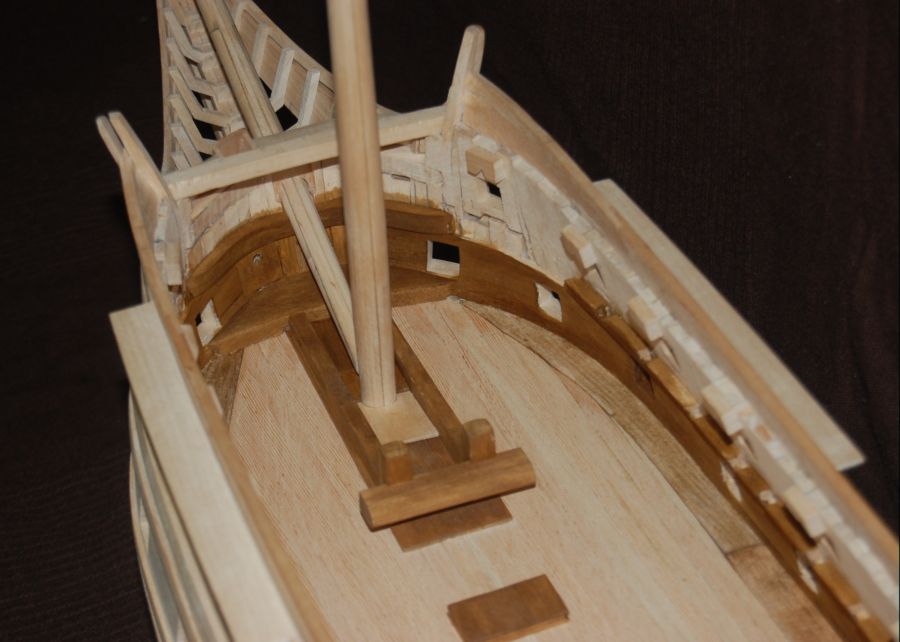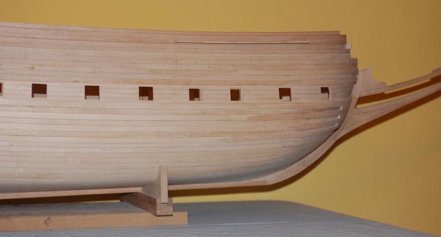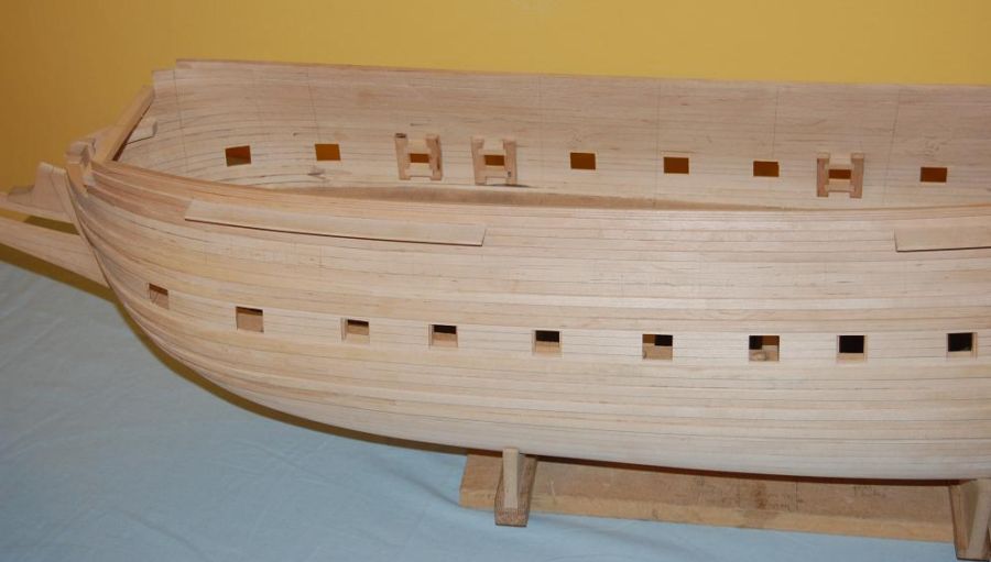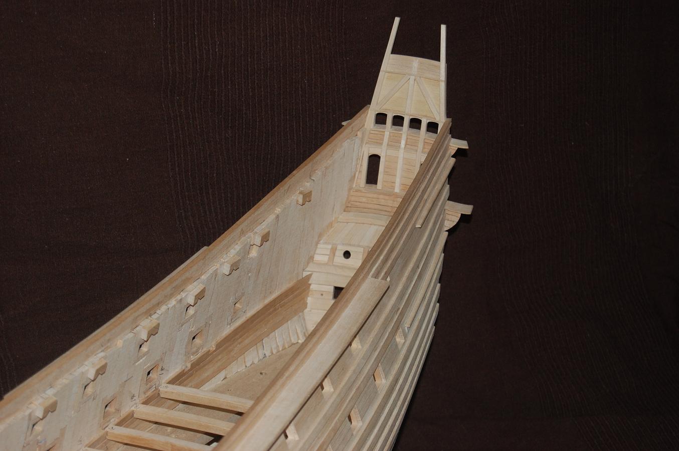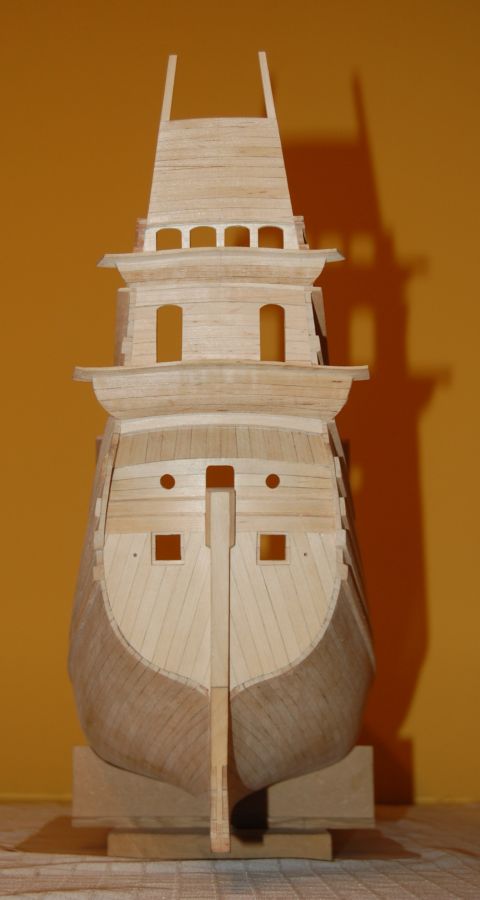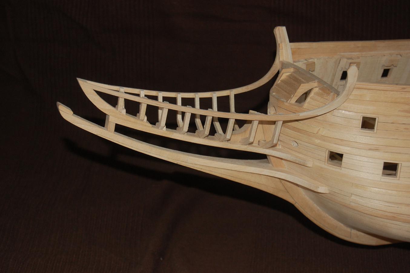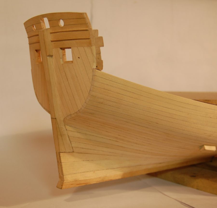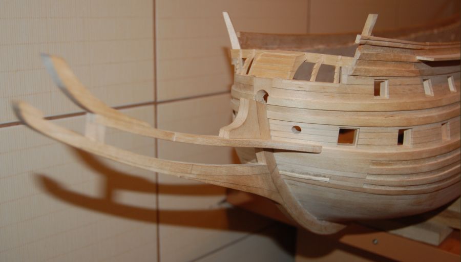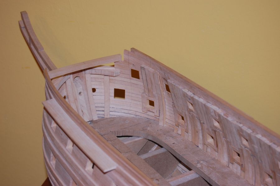 Po wykonaniu poszycia do czwartej odbojnicy musiałem ze środka wyjąć kopyto. Wkleiłem stałe wręgi z MDF-u i wypoziomowałem oraz wkleiłem stałą wodnicę. Do niej na powrót dokręciłem na wkręty wręgi i pociągnąłem poszycie w górę aż do listwy ozdobnej na której się zatrzymałem (chciałem mieć łatwiejszy dostęp do wnętrza kadłuba). Wręgi wywaliłem i wyciąłem ambrazury (rys 13 i 14). Następnie powklejałem skrzynki ambrazur i stałe wręgi (rys 15). Jednocześnie mogłem już wyciąć otwory w pawęży (rys 16) i przykleić policzki galionu (rys 17 i 18).