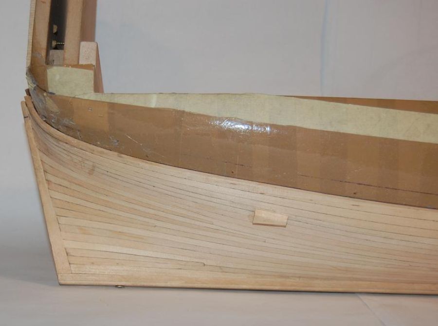 W miejscu gdzie stewa dziobowa łączy się ze stępką źle wytyczyłem bieg planek. Zaczęły nienaturalnie zakręcać. Kolejne układałem już bez ich wykręcania. Te, które były złe wydłutowałem i wstawiłem, korygując ich ułożenie.