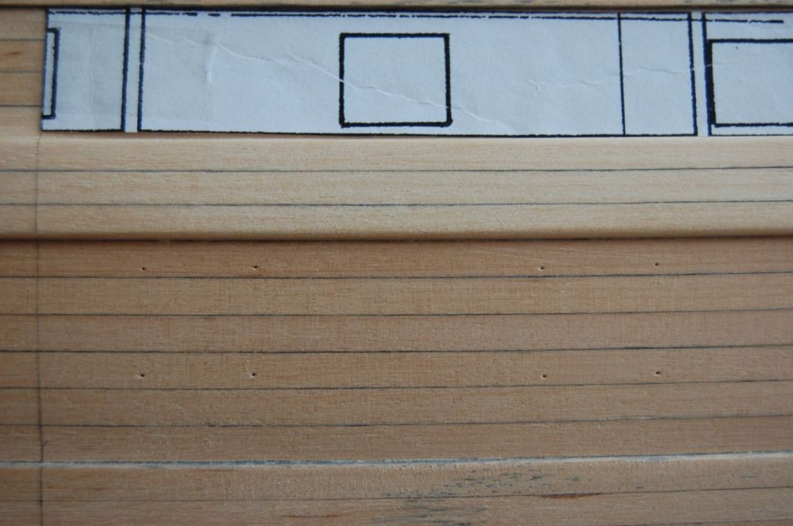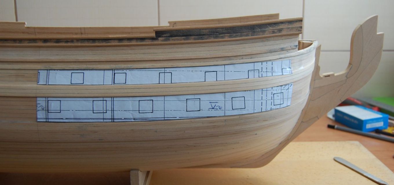 Obowiązki nie sprzyjają zabawie stąd udało mi się tylko przeszlifować kadłub i zająłem się trasowaniem ambrazur. Paski skopiowane i wycięte z planów posłużyły do wyznaczenia narożników jednakże wymagało to potem korekty i wyrównania ich w linii gdyż okazało się że czasami układały się schodkowo (rysowane były dość grubą kreską na planie i po przeniesieniu z płaskiego arkusza na obło kadłuba obarczone były błędem). Narożniki wierciłem i brzeszczotem do piłki włośnicowej chwyconym w klamerki wycinałem otwory.