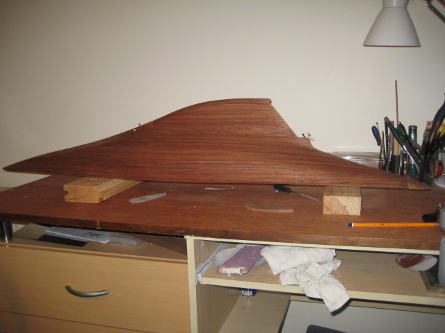 Witam. Wlasnie skonczylem poszycie kadluba.Uzylem mahoniowego forniru wiec zupelnie inaczej niz planowalem.Wyglada to tak.Pozdrawiam.