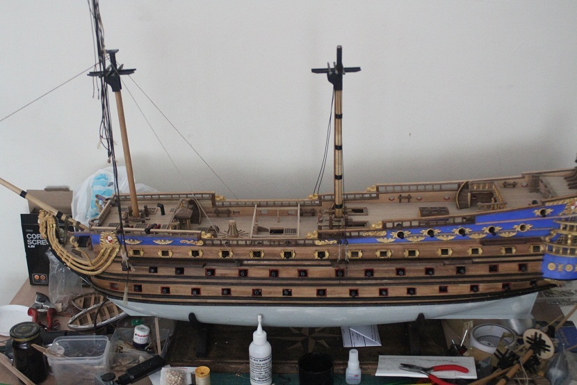 Cały kadłub został zakonserwowany miksturka składającą się z wosku oleju i bejcy, które zostały niedokładnie wymieszane aby uzyskać niejednolity kolor zabarwienia drewna co bardziej realistycznie oddaje delikatne ślady użytkowania okrętu. Zostawiam ją na jakiś okres czasu aby dobrze weszła w pory drewna.