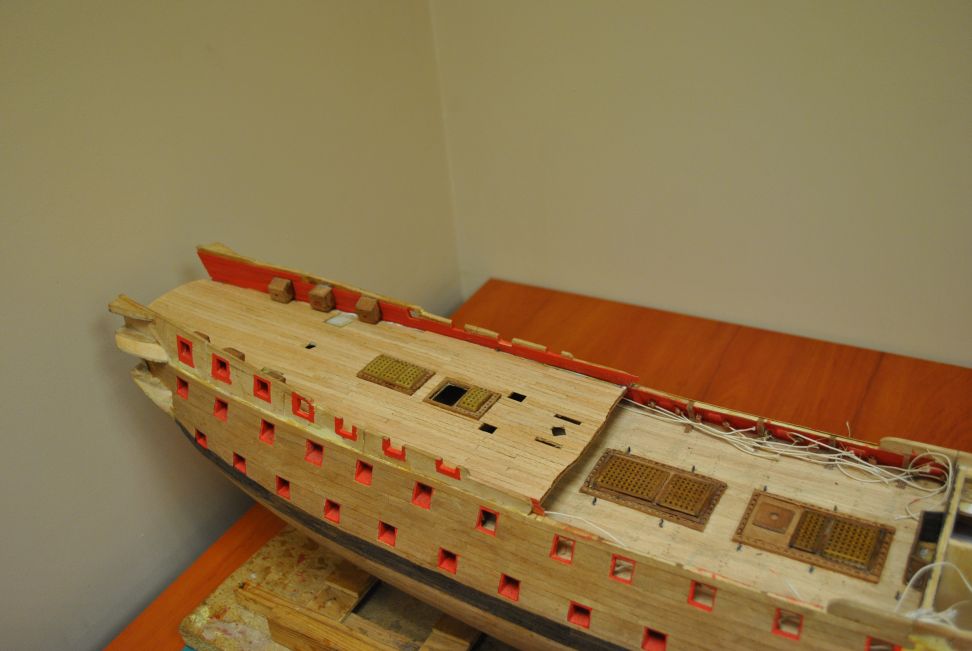 Zaczynam wykonywać pokład od strony rufy i przymierzyłem go do modelu. W tym pokładzie w okolicy grotmasztu są dwa otwory kwadratowe i dwa prostokątne. W materiałach które posiadam otwory te są odkryte. Czy te otwory posiadały jakieś przykrycie czy trzeba było na nie uważać. Może ktoś wie czy w liniowcach 74 działowych przy grotmaszcie i bezanmaszcie były jakieś bloczki i co wciągały.