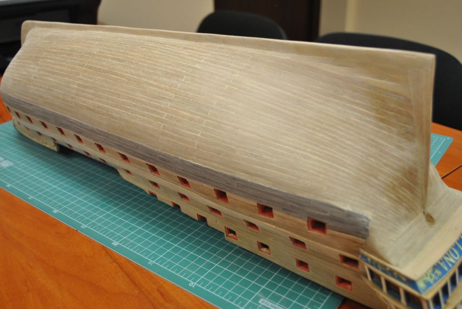 Przygotowuję się do miedziowania kadłuba od stępki do linii wodnej. Pierwszy raz szlifowałem kadłub. Na początku papierem 240, następnie 320 i na końcu 1200. Kadłub będzie polakierowany do linii wodnej.