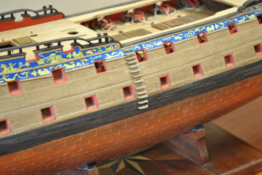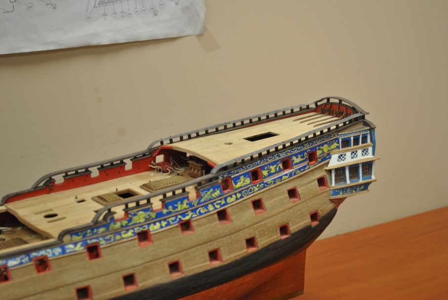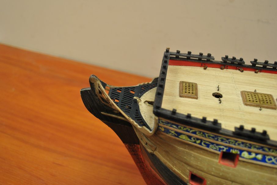 Relingi nadają modelowi uroku. Niestety popełniłeś błąd i boczne pokłady przykleiłeś odwrotnie. Rozszerzenia zaznaczone na czerwono powinny być od strony rufy.