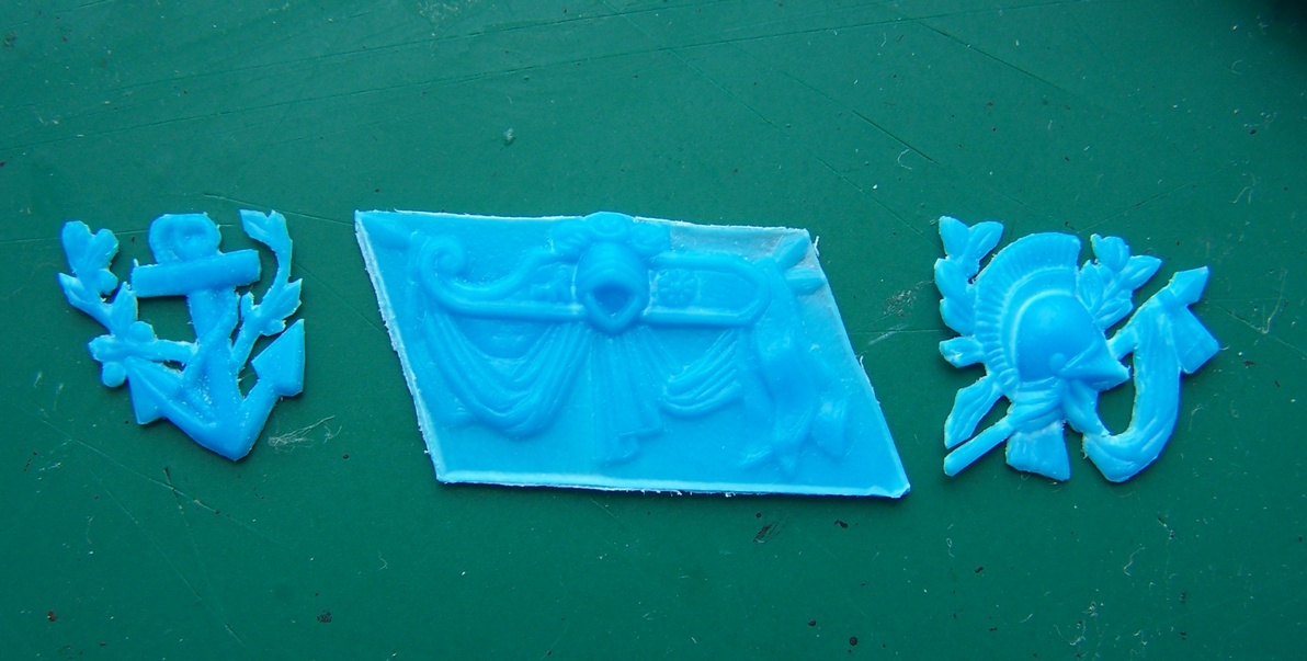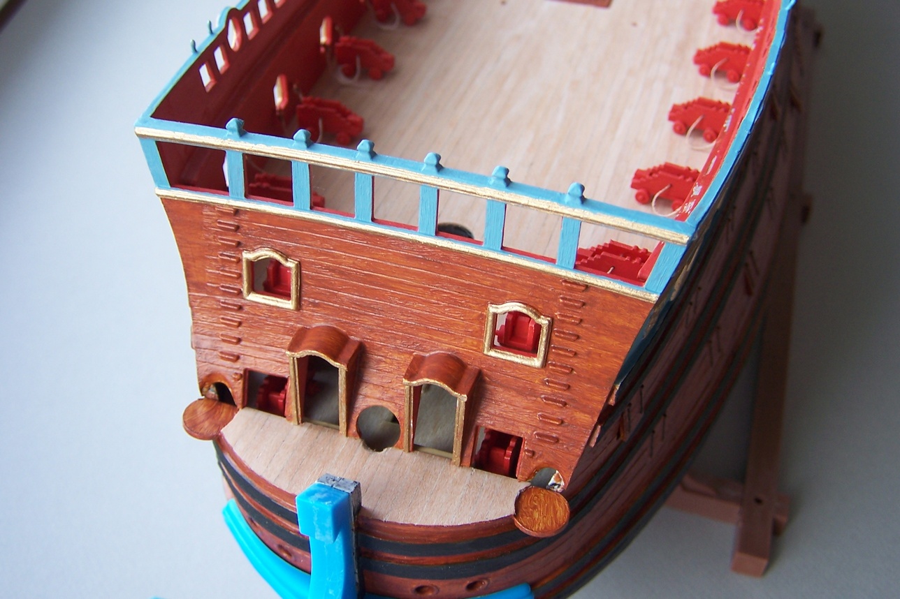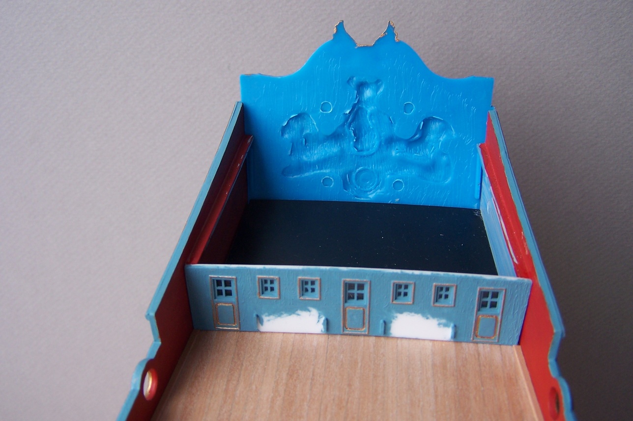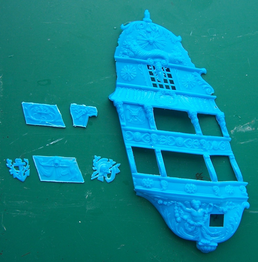 Przeróbka galerii rufowej.Jak widać na zdjęciach, wycinam panele z płaskorzeźbami, tak aby powstały otwarte balkony.Zeszlifowuję nadmiar plastiku do momentu, aż zostaną same zdobienia.Później maluję i naklejam na kadłub.Na tym etapie prac znajduję się obecnie.