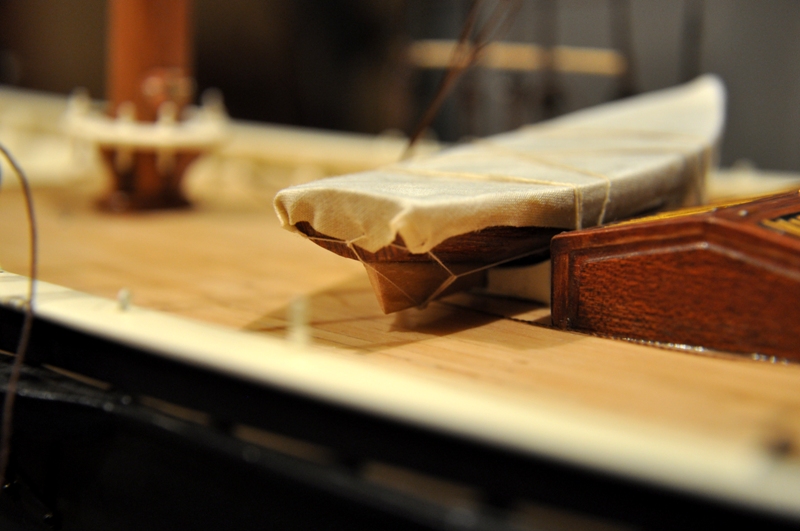 Tak jak obiecałem - podsyłam parę fotek szczegółowych. Może nie są najlepszej jakości, ale dadzą obraz jak to z grubsza wygląda. Dzisiaj szyje żagle. Zaczynam szyć, bo tak naprawdę, to nie wiem kiedy skończę. Potem zacznie się dozbrajanie pokładu, bloki do żagli i drzewc ruchomych, napinanie i dostrajanie olinowania. To będzie dłubanina. Miłego oglądania i nie pastwcie się za bardzo nad biednym "stoczniowcem" :-)))