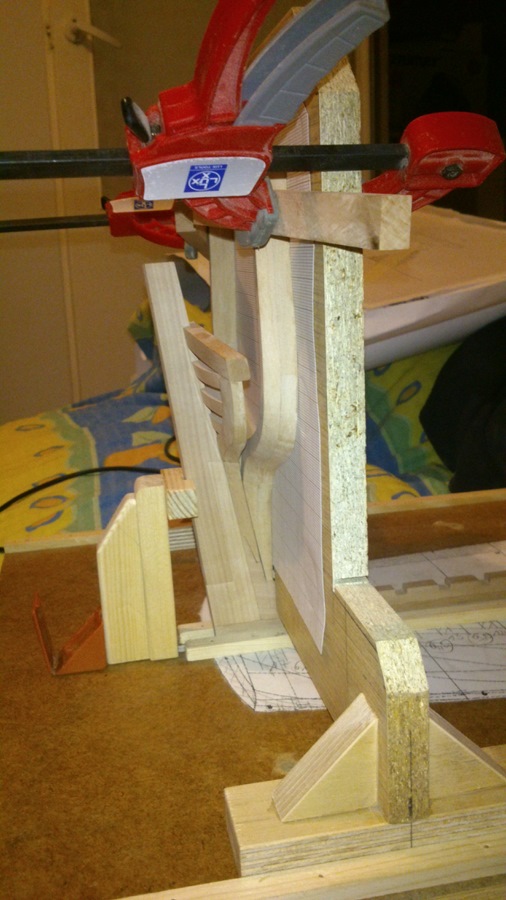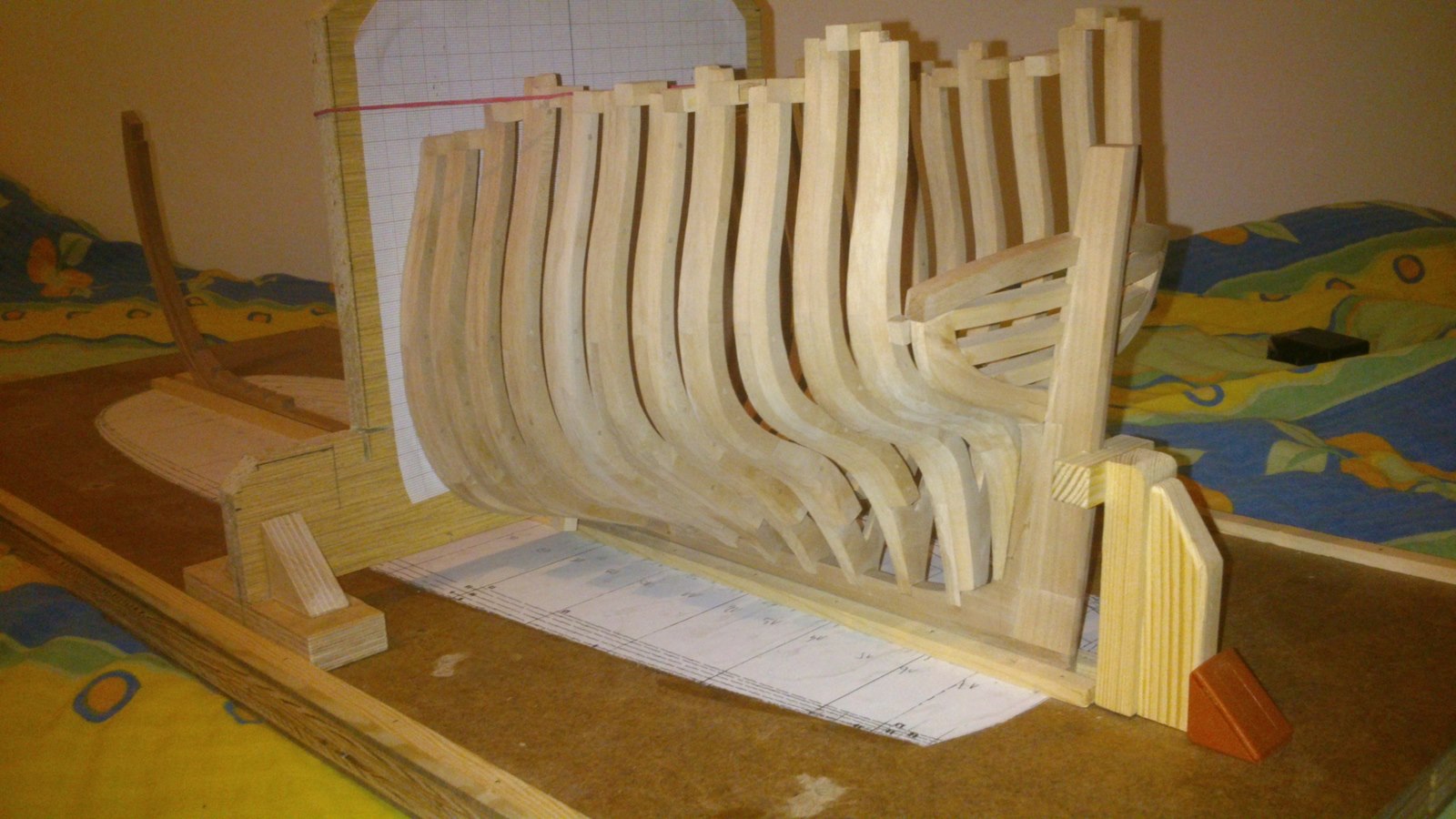 Witam, kołkowanie wręg wykonałem tak jak jest pokazane na animacji komputerowej z budowy La Belle. Wręgi już oszlifowane i zakołkowane no i w końcu zacząłem montaż wręg na kilu. Najwięcej czasu i pracy zajęło mi ich wykonanie oby to już jakoś bez większych problemów "poszło".