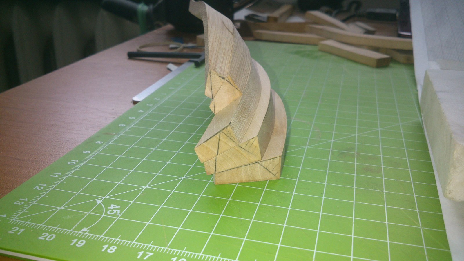 Wykonanie dzióbka metodą wykreślną jest bardzo trudne.Też miałem z tym problem.Zrób go w/g szablonu, metodą dopasowywania krawędzi.Naddatki zewnętrzne i wewnątrz zbierzesz łatwo szlifierką lub klockiem z papierem ściernym.Ewentualne niedokładności zatrzesz na klej, podczas szlifowania.Może te zdjęcia z mojej roboty Ci pomogą.Przepraszam,że nieco zaśmiecę.Pozdrawiam.Kazimierz