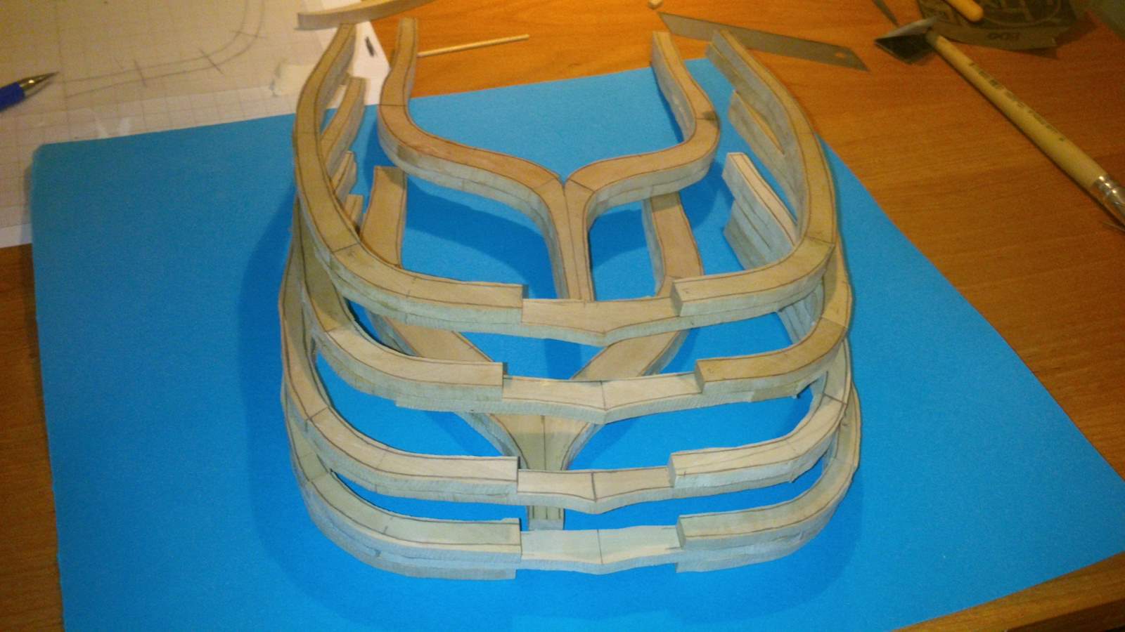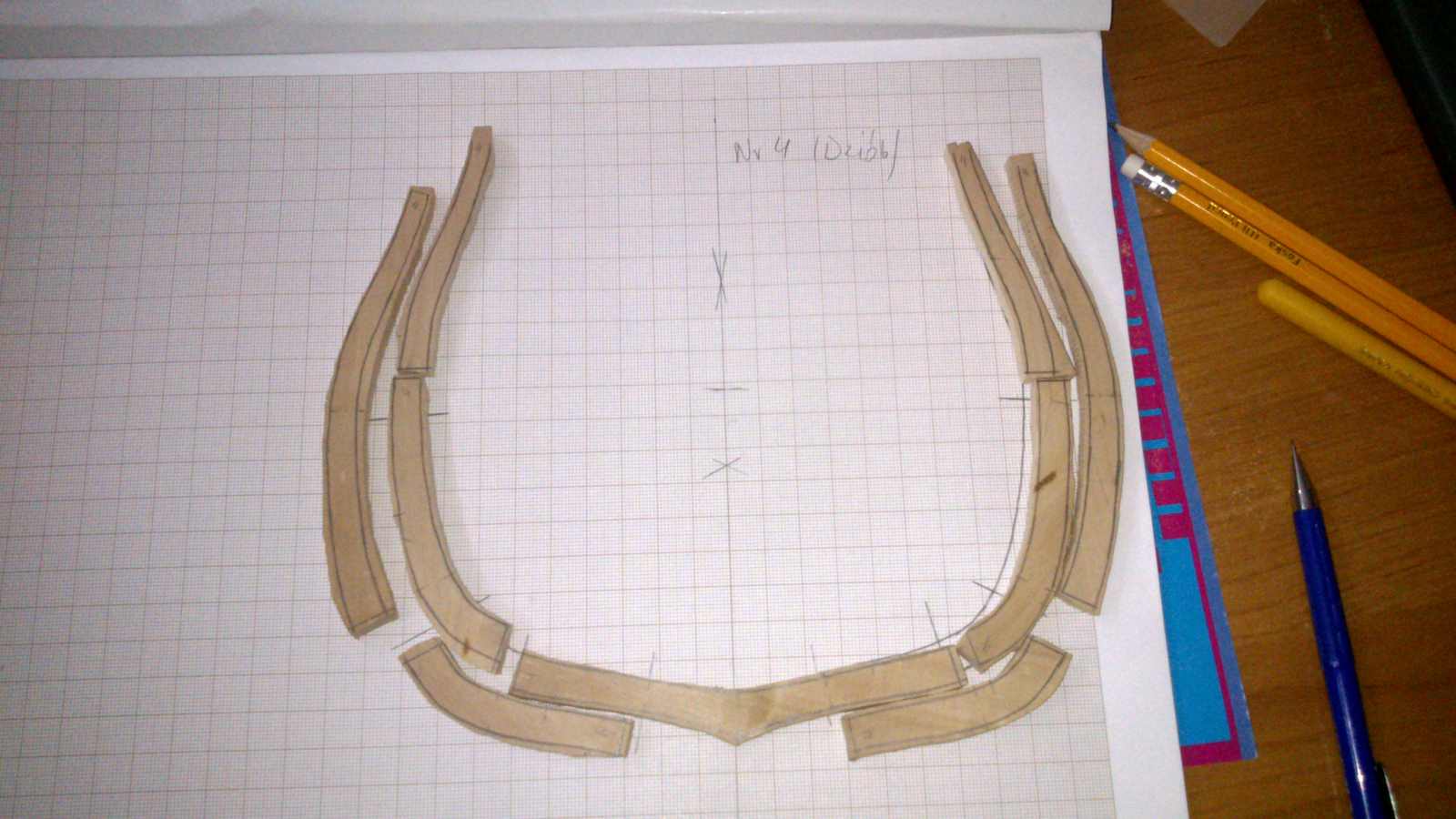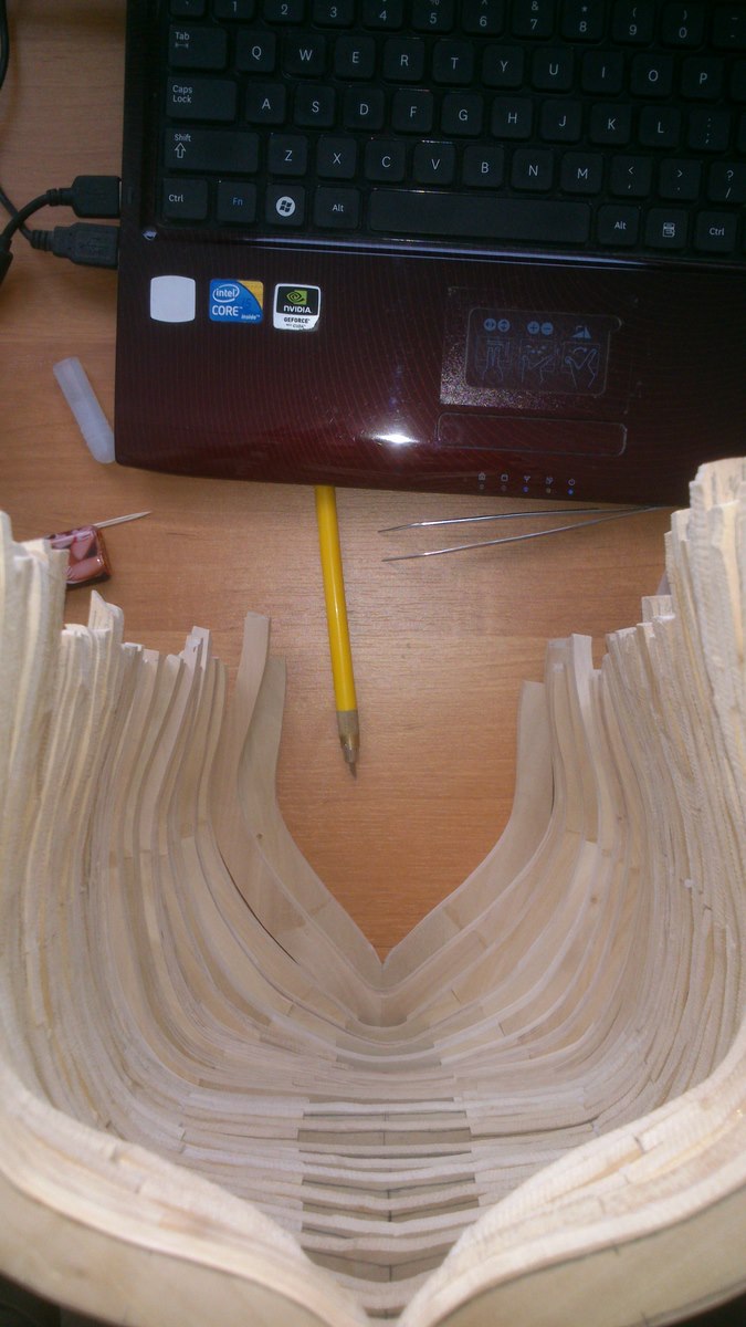 12 wręg z wręgą M w stronę dziobu posklejane, a kolejne powoli się kleją. W sumie sklejonych mam już 15 wręg a do zrobienia zostało jeszcze 14.