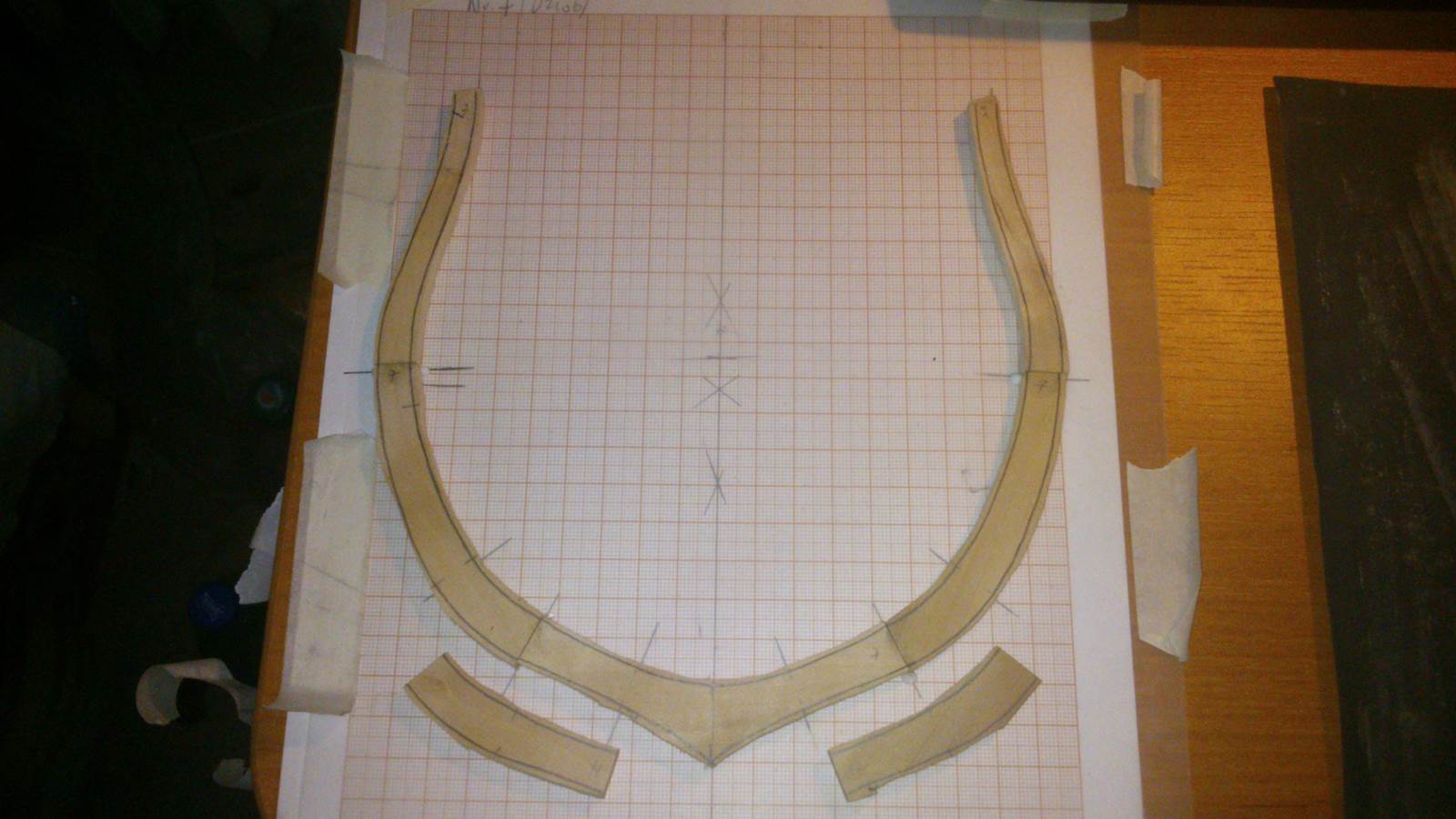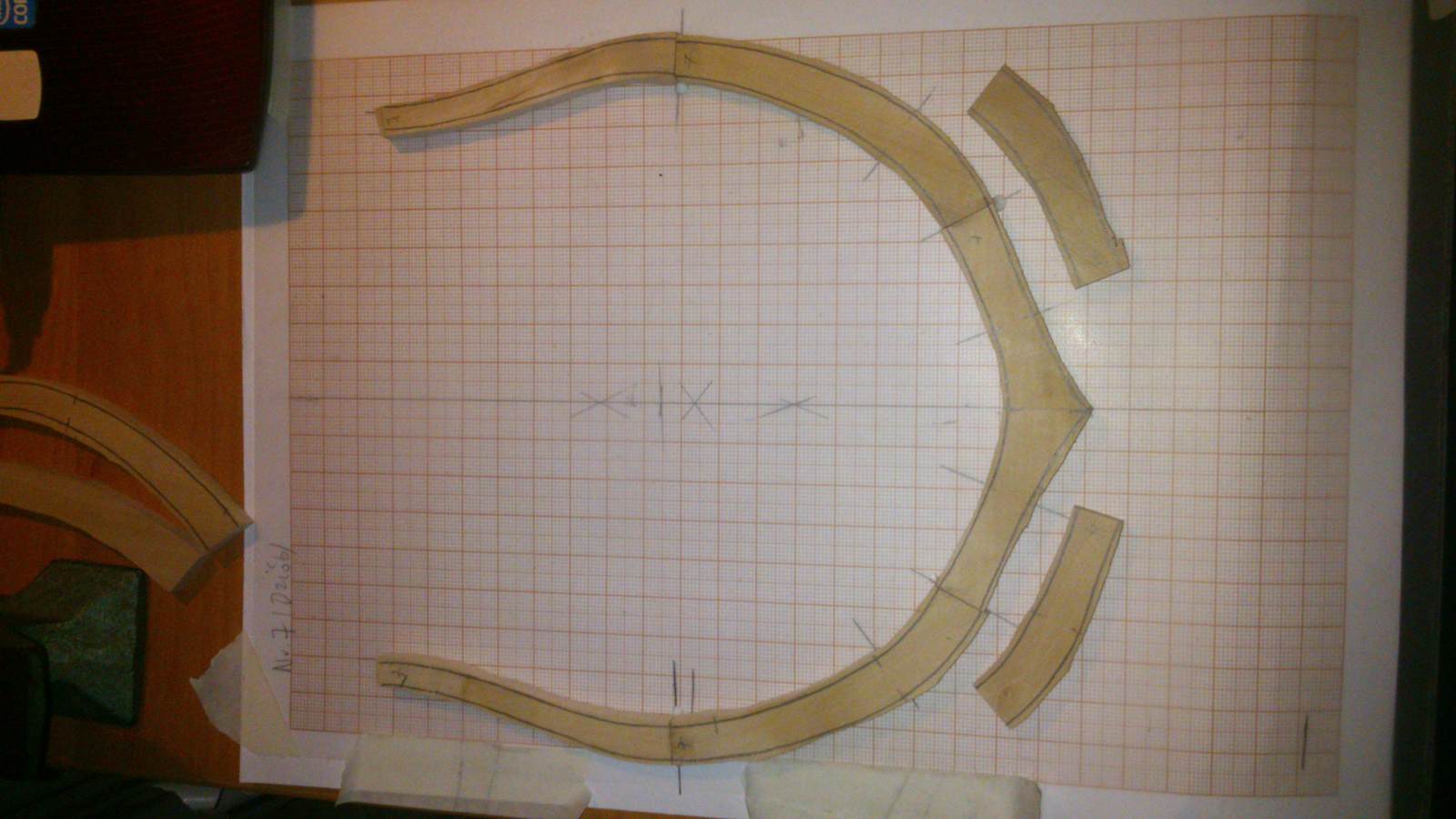 Na wcześniej odrysowanym szablonie wręgi na bloku milimetrowym układam elementy wręgi i sklejam po dwa elementy na raz i układam no to obciążenie. Po kilku minutach cykl powtarzam i tak do sklejenia całej wręgi( po między blok milimetrowy, a wręgę którą sklejam wkładam folie żeby klej nie przykleił się do bloku).