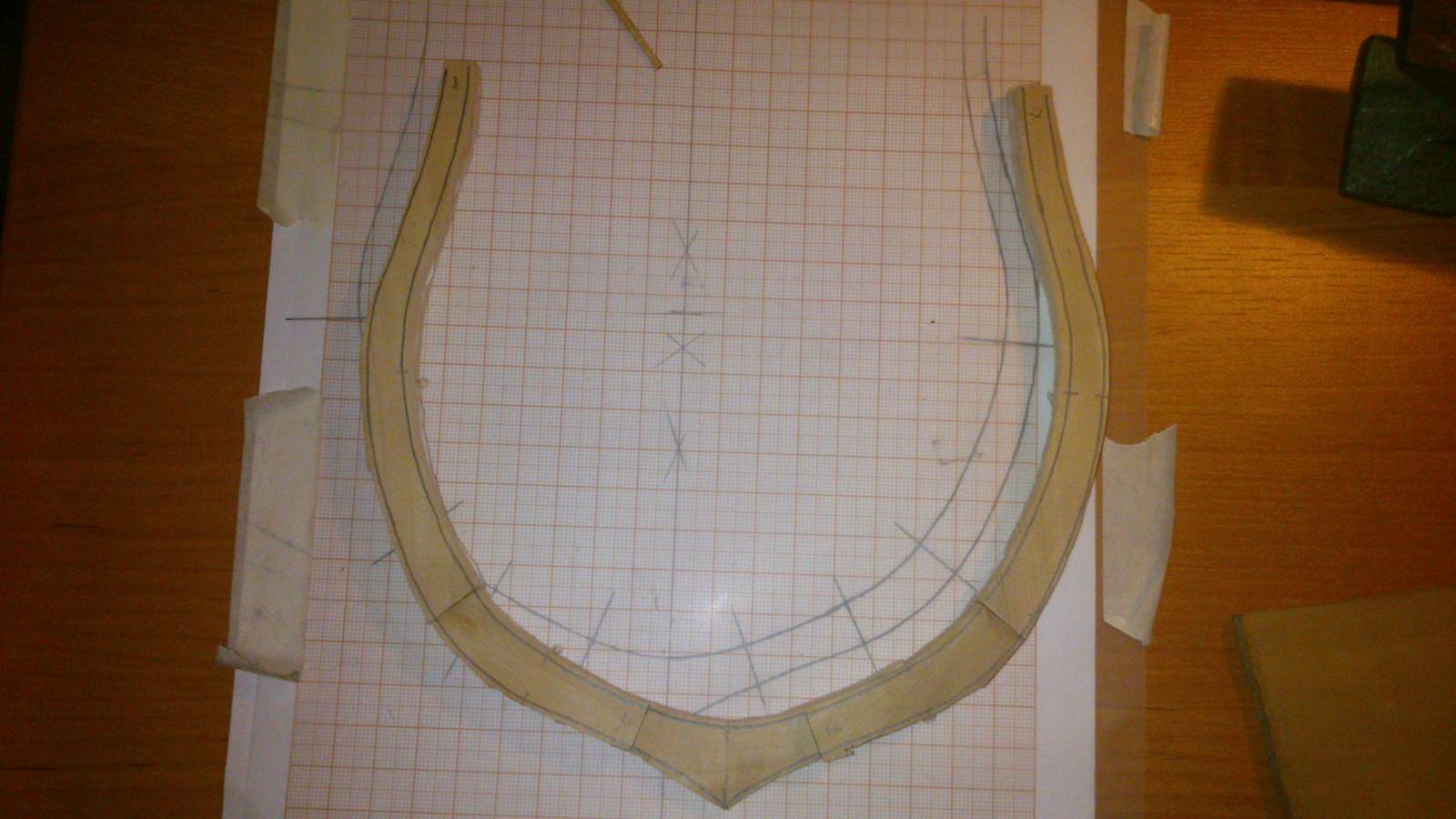 Następnie odbijam kształt połówki wręgi na kartkę bloku milimetrowego i odbity kształt poprawiam ołówkiem.