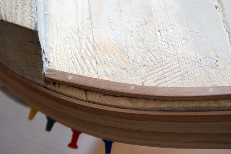 To są nierówności listewek, zresztą niewielkie. Znikną podobnie jak ewentualne szpary po szlifowaniu. Model który buduję nie ma odbojnicy w ścisłym tego słowa znaczeniu. Do ciemnej listwy (pierwszej od pokładu działowego) są listewki 2 mm . ciemna listwa ma 2,5 mm, kolejna będzie miała 3, 3,5 i następna 4. Wszystko to po to :