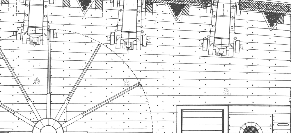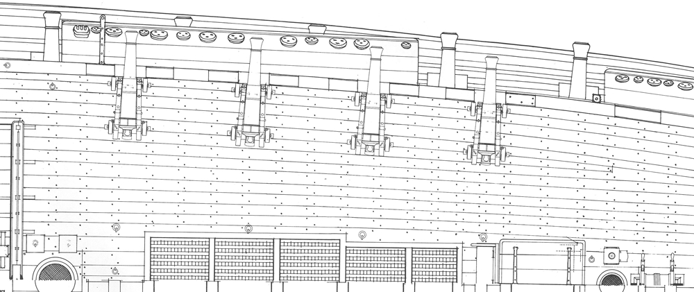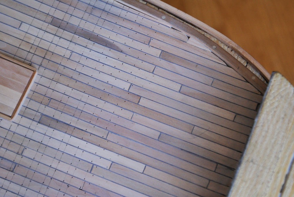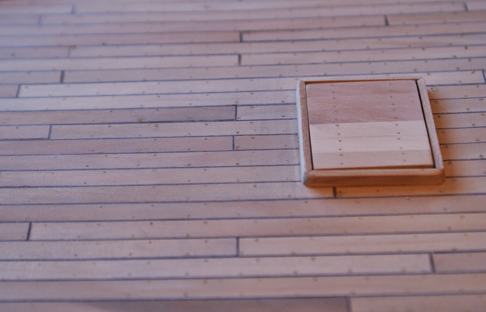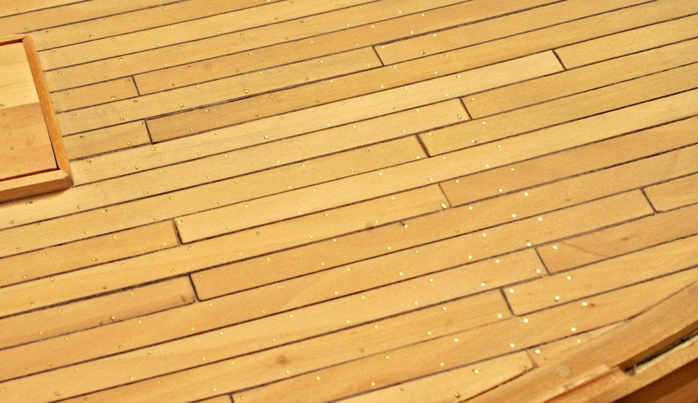 Gwoździowanie pokładu artyleryjskiego. Materiał drut mosiężny M63, średnica 0,5 mm. Ilość gwoździ na tym pokładzie: około 4200 szt