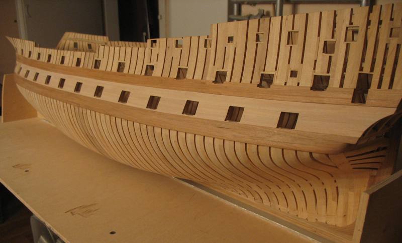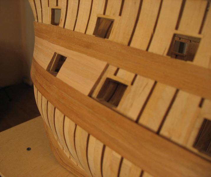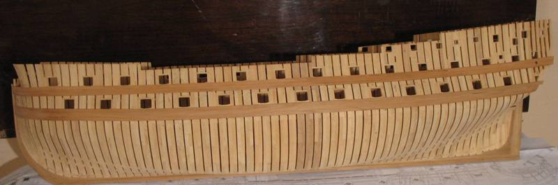 Pierwszy fragment poszycia położony, troszkę utrudnień było gdyż się okazało, że odległości między odbojnicami nie są równe, lecz się rozszerzają od dziobu w kierunku rufy i każdą listewkę poszycia należało odpowiednio przeszlifować na szerokości oraz odpowiednio zeszlifować na grubości gdyż też się zmniejszają od dołu ku górze.