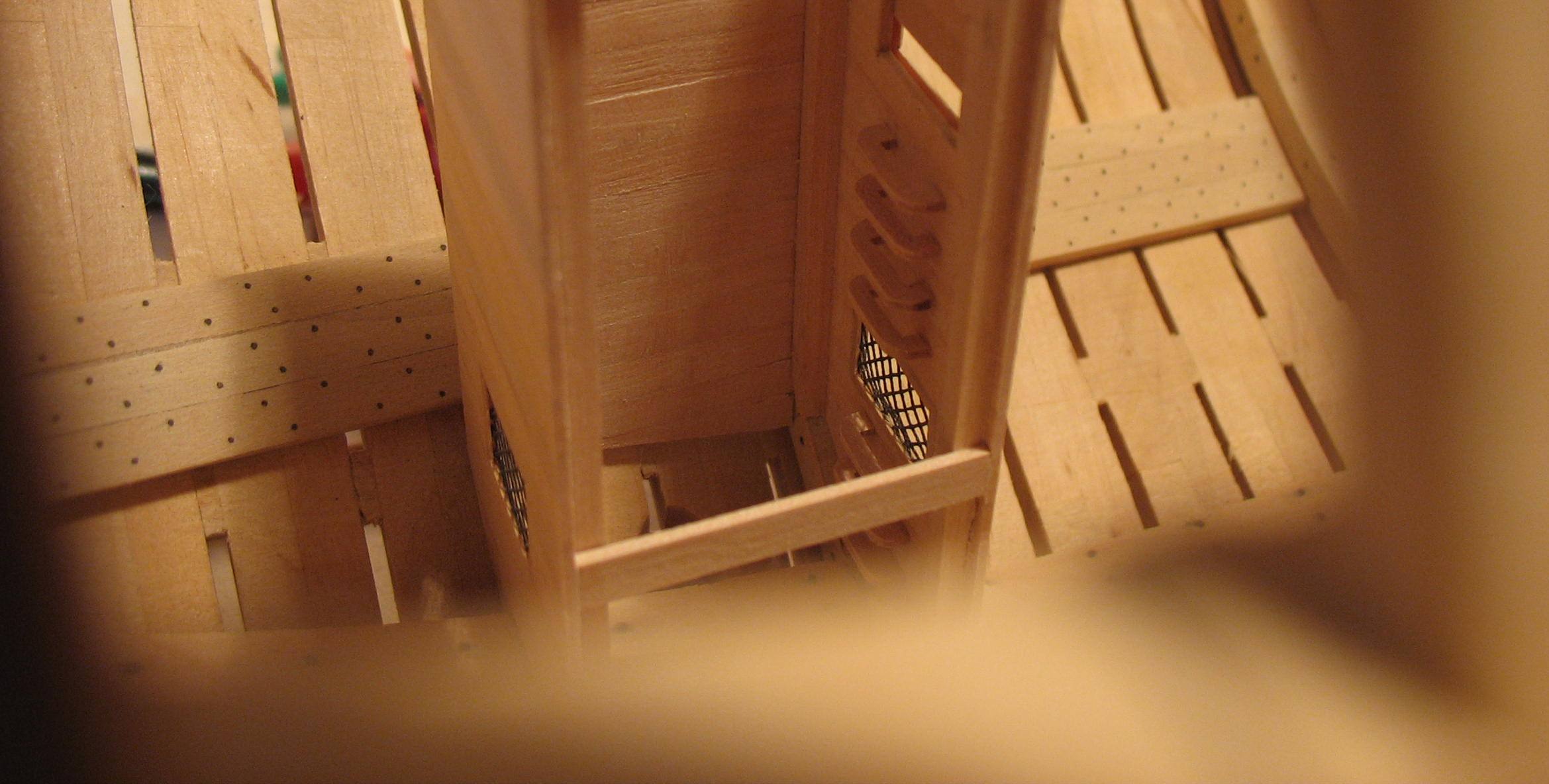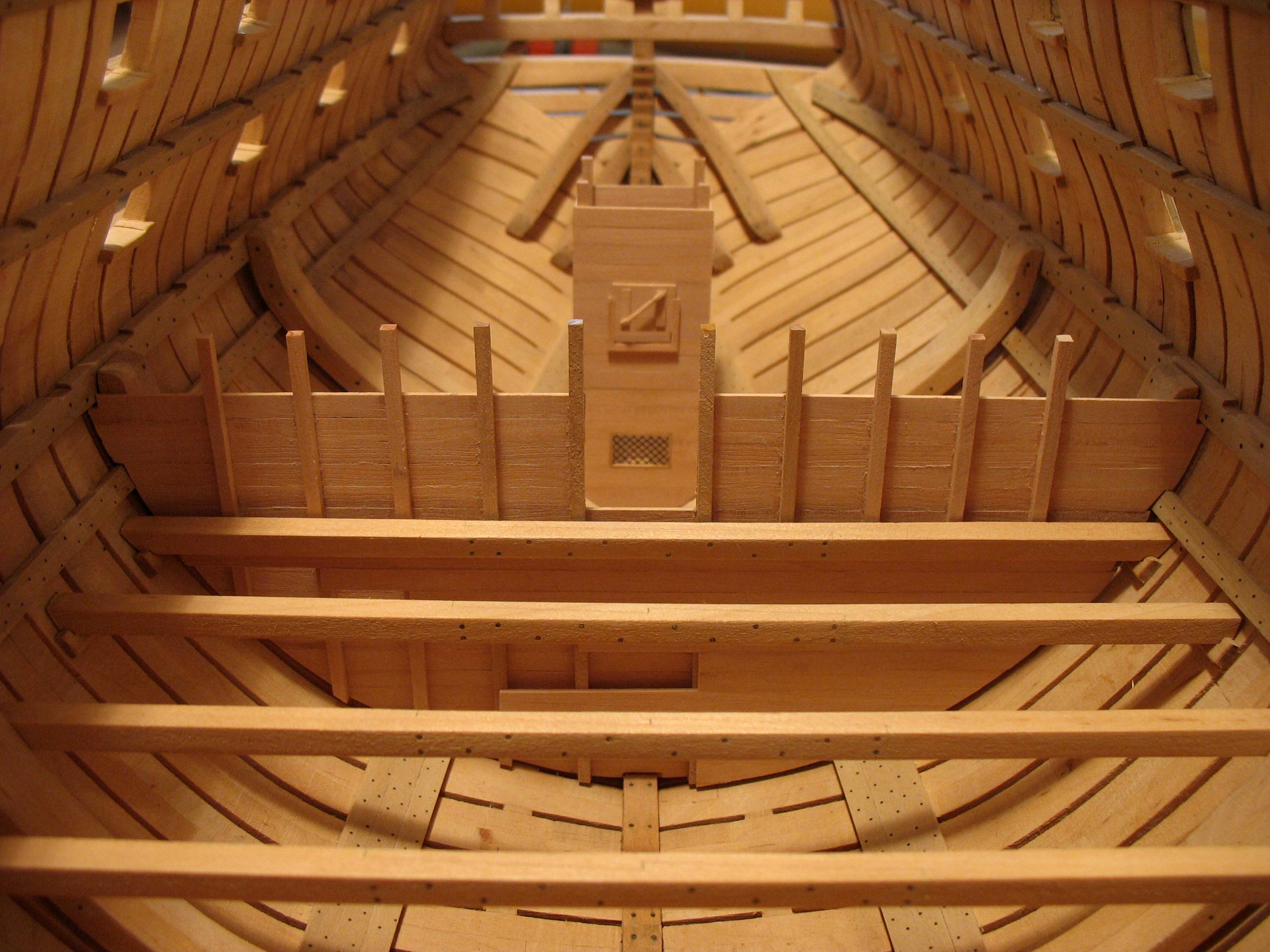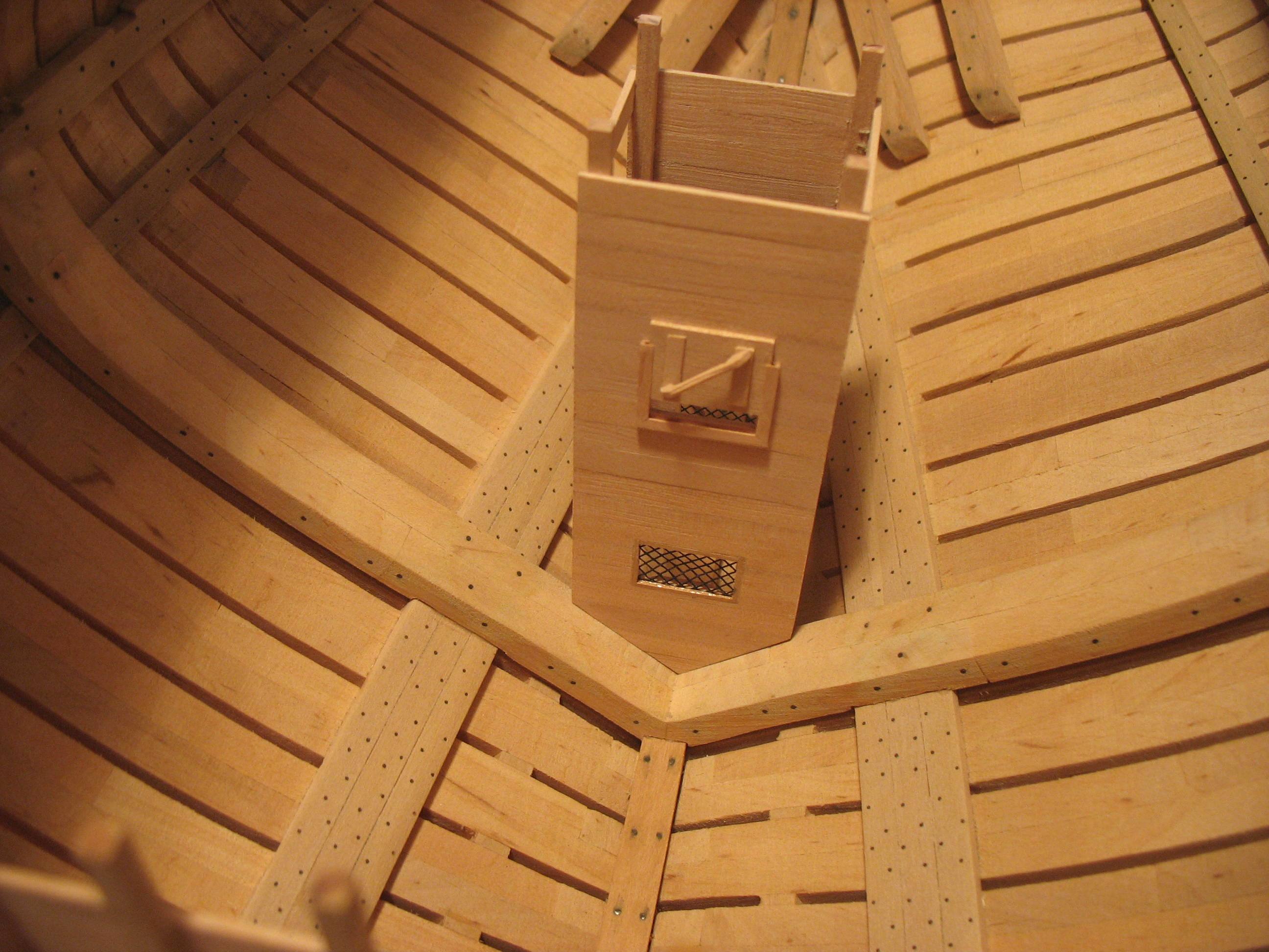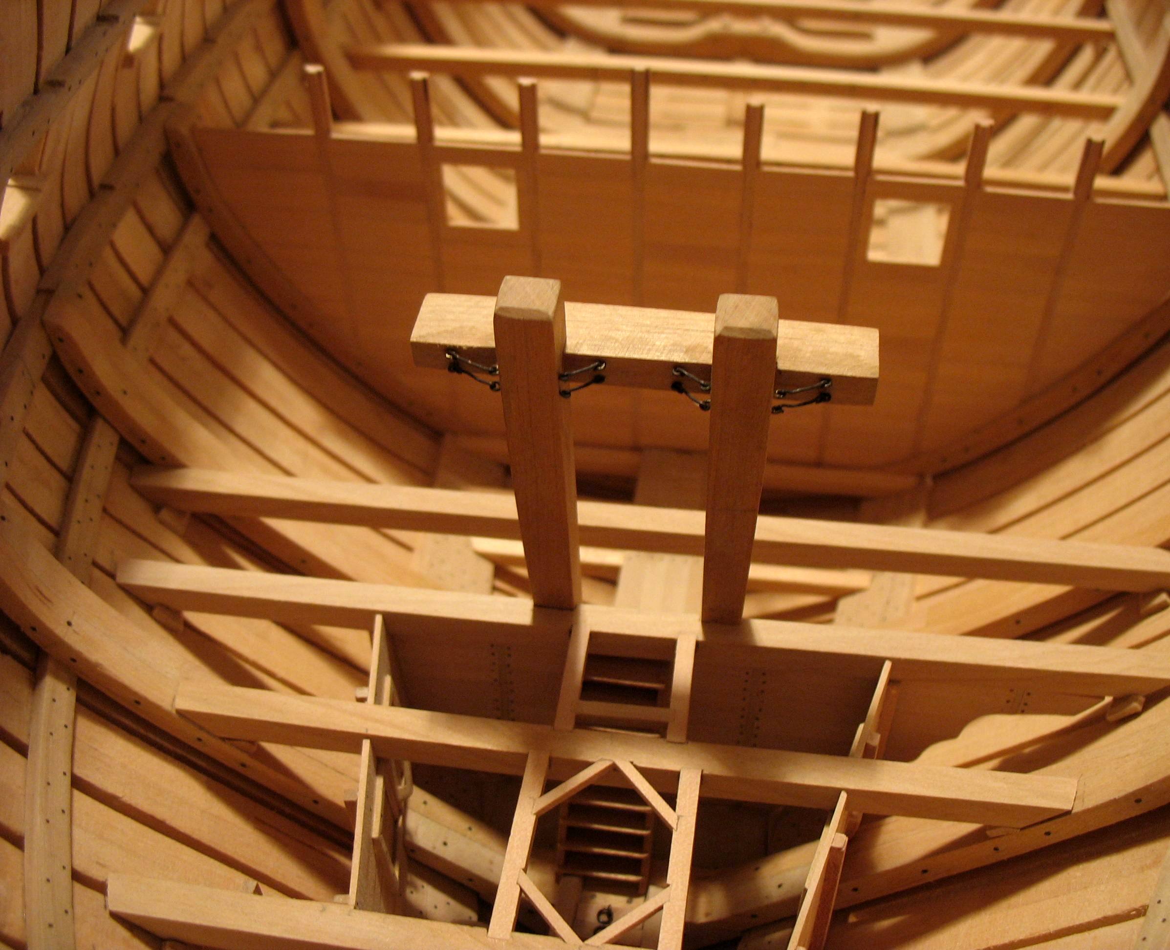 Samo owinięcie pachołów nie wystarczało do całkowitego unieruchomienia liny kotwicznej, dlatego stosowano jeszcze stopery jest to odcinek grubej liny zaczepionej na jednym końcu wokół oczka sworznia metalowego, a z drugiej zakończony w węzeł i mocowany kilkoma cieńszymi linkami do liny kotwicznej.Oczka metalowe były mocowane na dodatkowych belkach ułożonych na pokładzie przed pachołami kotwicznymi w kierunku dziobu będzie to wykonane w późniejszym czasie jak zostanie zrobiony pokład.