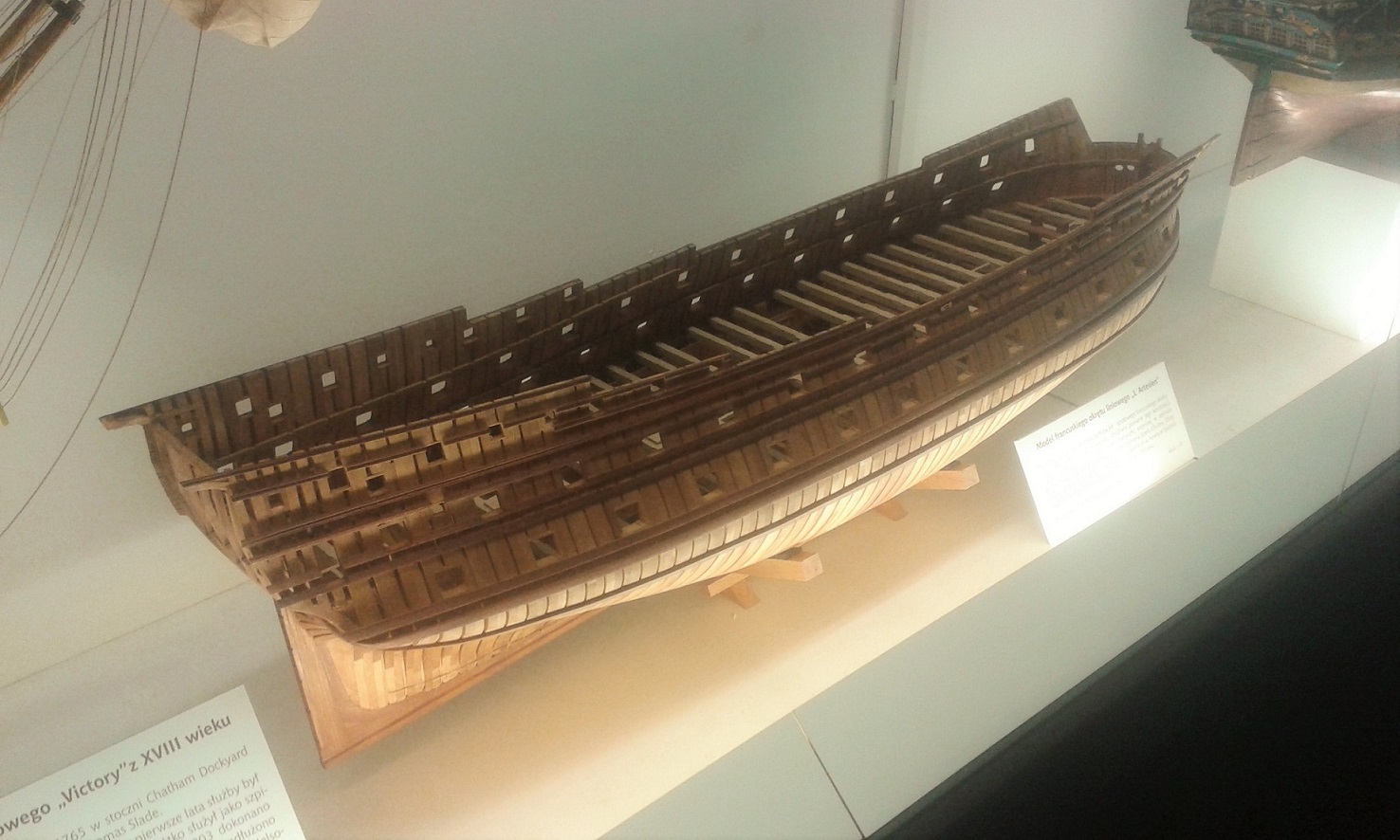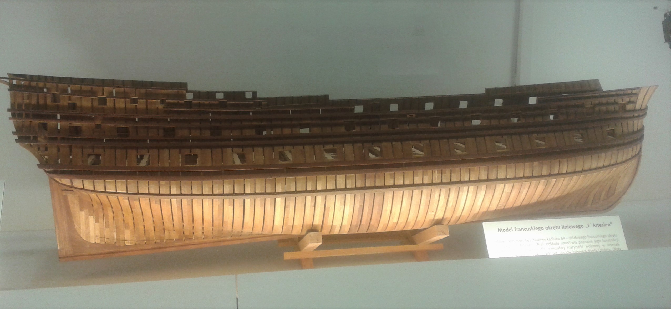 Model po wystawie w Tczewie wzbudził zainteresowanie Dyrektora Narodowego Muzeum Morskiego w Gdańsku i od jakiegoś czasu już tam stoi . W Muzeum powstaje nowa stała wystawa związana z historią budownictwa okrętowego, która ma być otwarta jeszcze w tym roku i model ten będzie jednym z eksponatów tej wystawy i właśnie najbardziej im pasowało że jest tylko sam kadłub gdzie widać cały środek z wyposażeniem właśnie pod pierwszym pokładem i poszczególne wręgi i absolutnie nie interesowało ich zakrywanie tego i dalsza budowa .Przepraszam wszystkich zainteresowanych i oczekujących na wznowienie relacji ale takim propozycjom z Muzeum się nie odmawia :D. Mogę jedynie zapewnić że zostanie rozpoczęta nowa budowa kolejnego modelu w ten sposób jak tylko czas i możliwości pozwolą . Pozdrawiam i do następnej relacji .