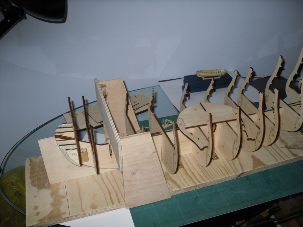 Zmontowałem stępkę na prowizorycznej stoczni, którą widać na zdjęciu dodanym poniżej. Wręgi okrętu prostowałem, ale cieszy mnie tylko fakt, że nie było zbyt wiele elementów do prostowania, następnie wszytko skleiłem. Teraz jestem na etapie montowania stoczni z planów, które znalazłem. Po jej zmontowaniu zabieram się za łączenie stępki z wręgami. A oto kilka zdjęć z montażu stepki.