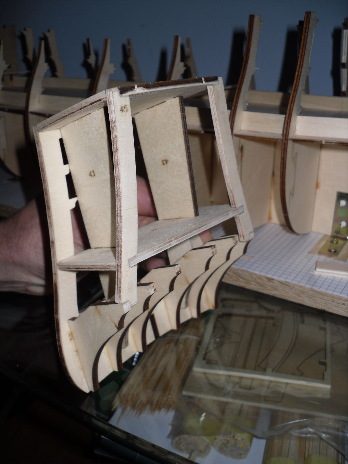 Kolejny etap to montaż wzdłużników miedzy pokladem 1 a pokładem 2 oraz pokładniki . Dolny poklad nr1 bedzie niewidoczny przez luki działowe . Zamontwane zostaną tam atrapy dział. Wkleiłem też szkielet galeryjki rufowej.