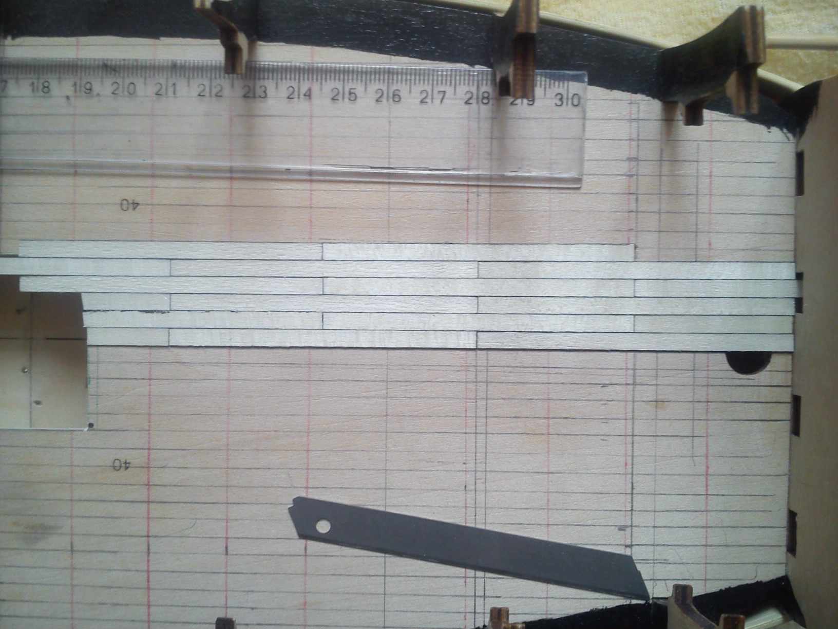 Wytrasowałem na pokładzie środkowym linie deskowania, będą pomocne przy układaniu pokładu tak aby deski były w lini prostej ,zarówno na szerokości pokładu jak i jego długości .