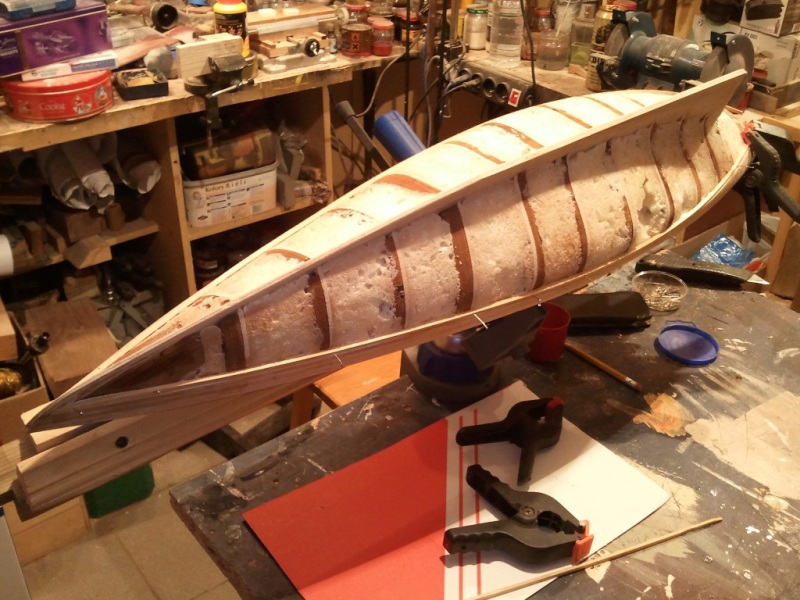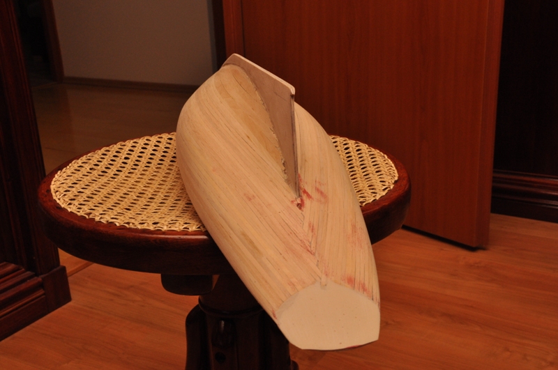 Stosowanie 3mm klepek poszycia kadłuba miało na celu pozostawienie ich bez pokrywania tkaniną rowingową i epoksydem. Zastosuję swoją metodę (choć nie jestem pewien, że to moja). Na burty 2-3 warstwy czarnego tuszu kreślarskiego (albo czarnej bejcy ) i na to położony gorący wosk pszczeli. Potem ogrzewanie kadłuba i polerowanie szmatką bawełnianą. Na część podwodną matowy akryl w kolorze minii. Robiłem próby i nieźle to wygląda. Nie wiem tylko jak będzie to wyglądało na kadłubie. Chodzi o zarys klepek.Oby dobrze, bo ciężko będzie położyć epoksyd na wosk pszczeli. Może ktoś coś podpowie. Zapewne Mirek będzie miał "swoje lekarstwo".
