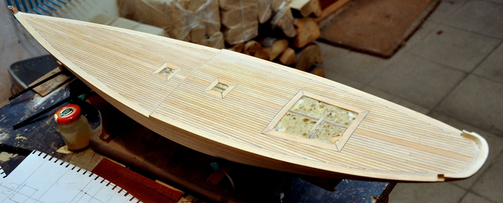 Dzięki wskazówkom bardziej doświadczonych kolegów wykończyłem prawie pokład. Kołkowanie klepek pokładu zrobione jest igłą lekarską fi.0,5 mm (wewnętrzna średnica fi.,04 ). Bardzo dobry pomysł. Mnie to jeszcze niespecjalnie wychodzi, ale w następnym modelu będzie już lepiej i jeszcze lepiej.